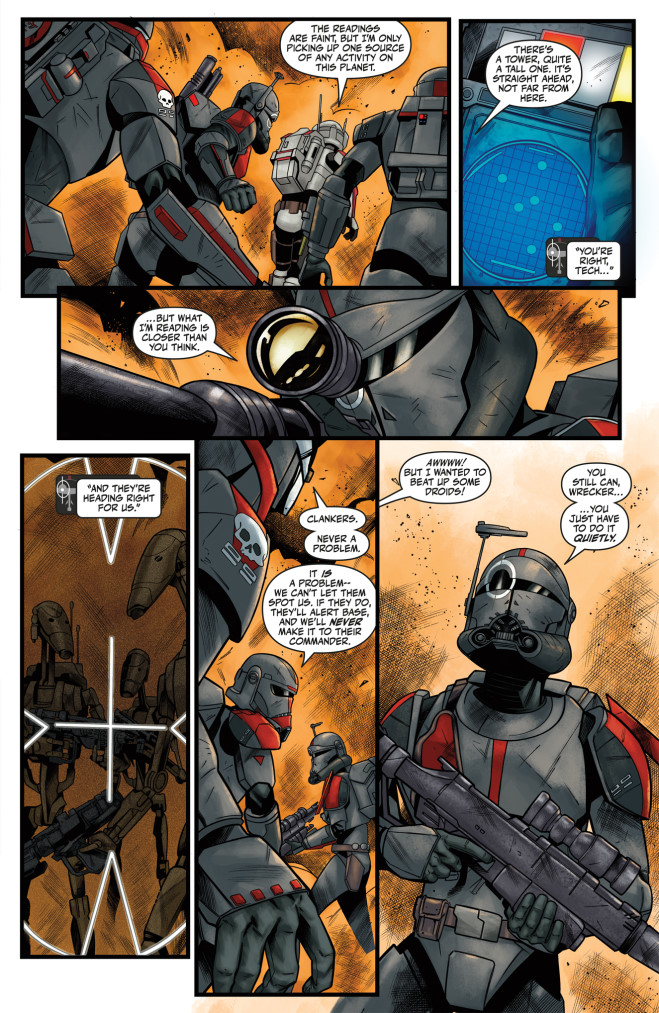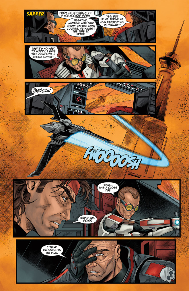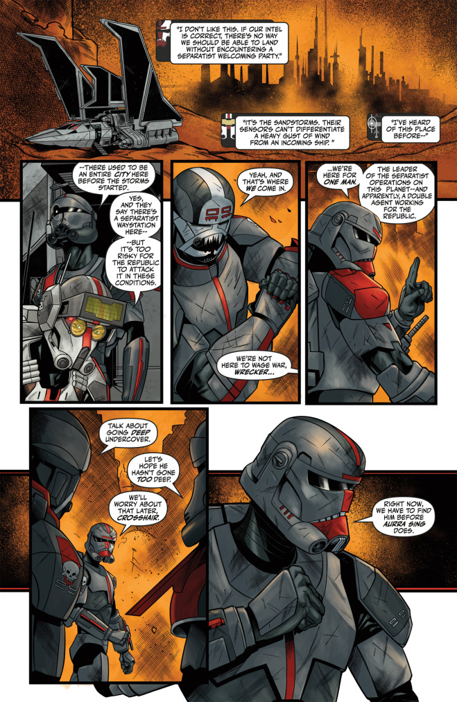 We launch the fifth and final issue of Ghost Agents with our clone heroes in a bit of a spot as Tech steers the Havoc Marauder through a blinding sandstorm at high speed, enough to unsettle the stomach of Wrecker and lead to Hunter ordering him to bring the ship down. They’re in a race against time; get to the elusive ghost agent before Aurra Sing and get him away from his deep cover as a Separatist commander before Sing can end him, and do it as quickly and as quietly as possible.