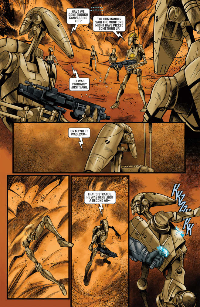 Moving through the sandstorm they spot the shadowy outlines of Battle Droids, and we watch as a gleeful Wrecker and his clone brothers take them down, turning around to find the towering installation, their target location. Now knowing there’s no other option, they gird themselves and pile in, blasting their way through the throng of Battle Droids as they attack, and we’re treated to a pacey and high-octane action scene as the droids are dispatched and we finally see the ghost agent, still very much undercover as he tells them they’ve made a huge error….until Hunter tells him about the list and how it’s been compromised. As soon as the ghost agent realises Aurra Sing is on his tail he turns to the nearest Super Battle Droid and ends it, prompting Hunter to reiterate how quickly they need to move, only for Aurra to drop through the glass ceiling.