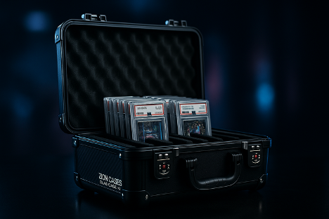 According to Vaulted, its flagship case wraps a ribbed aluminum shell around collector-grade EVA foam, giving you the feel of a pro camera briefcase rather than a hobby box. The Stealth 4-row model stores 112 PSA slabs or 76 BGS slabs in four friction-fit channels.