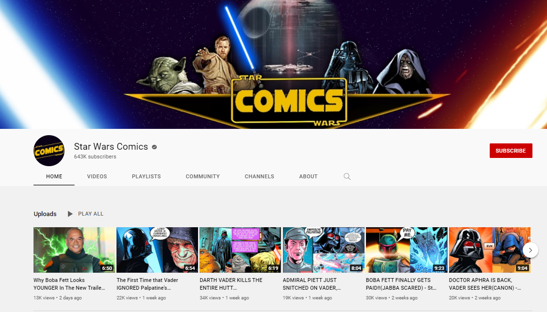 Unlike the previous channel in this list that is filled mostly with animation and different footage available online, this channel is focused on the comics that are dedicated to Star Wars. Comics are a very huge part of modern pop culture, and for people who haven’t been interested in them before, the variety and choice among the series can be difficult. The channel helps users to swim through the graphic universe and find a strong community to share their hobby with.