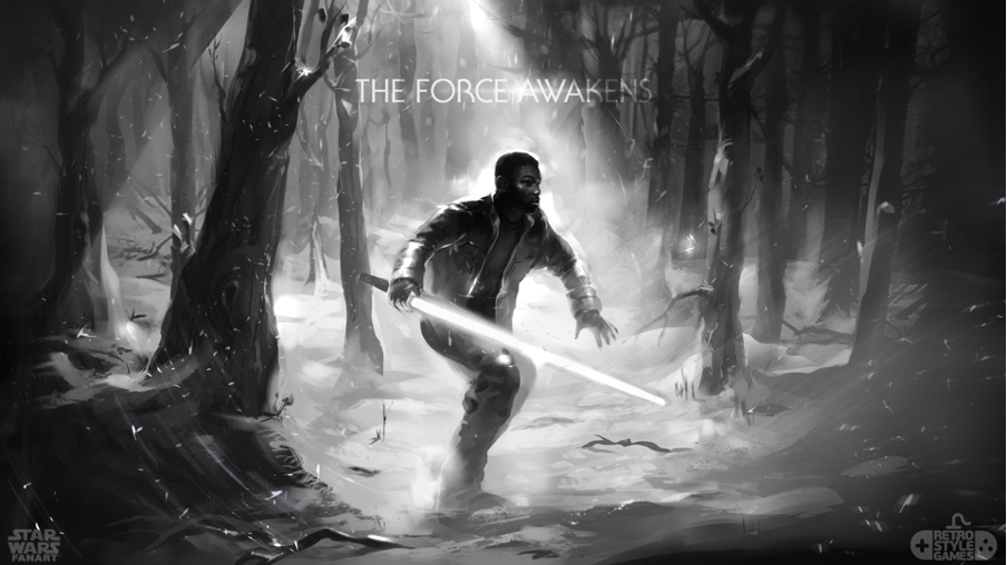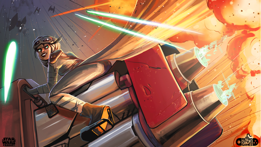In our opinion, this art best reveals the talent of the RetroStyle Games studio. Attention to detail, especially in pixel art, is done at a professional level. Of course, the central character is Kylo Ren. Again, the attention to detail is surprising: thanks to the pixels, it was possible to convey the shabby clothes, the shadows on the tree, and if you look closely, even the snow melted under the heat of Kyle’s lightsaber. In turn, the character’s stance also conveys Finn’s beautiful combination of selfish fear and reluctant heroism. This work stands out among other Star Wars art images due to the interesting style and iconic confrontation of these characters.