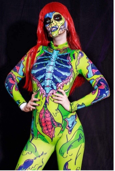 Here comes another Halloween costume in the form of a bodysuit – both zombie and punk, both rotting and rotten! It is vivid, drop-dead gorgeous, and dreadfully foxy – with vibrant colors and an all-over print of decaying flesh over an electric blue skeleton.