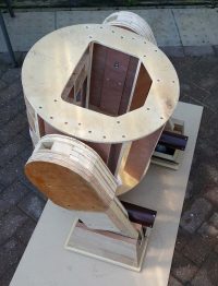 So far I have the drive units assembled, the legs are in their early stages and I have a skeletal frame for the main part of the body. I like to do things as economical as possible so alternative materials are good finds. The circles for the C1’s body were from wooden cable drums that just happened to be the correct diameter. The outside of the body will be covered in a plastic skin.