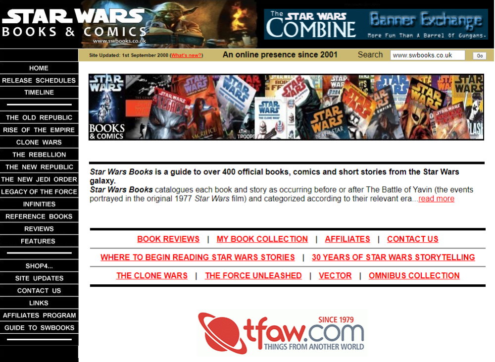 It was at this time that I had joined the “internet revolution”, when cheap internet access was made available through the likes of Freeserve and FreeNetName. At first, I published a non-Star Wars website that ran for a couple of successful years, but it had run its natural course. So in late 2001 I launched “Zee Zee’s Star Wars Books Emporium” – a rather pompous and ever so uncatchy title 😉 – but its mission to provide an easily accessible and cross-indexed source that listed all official stories (books, graphic novels and short stories), remains the same today for Star Wars Books as it did in 2001.