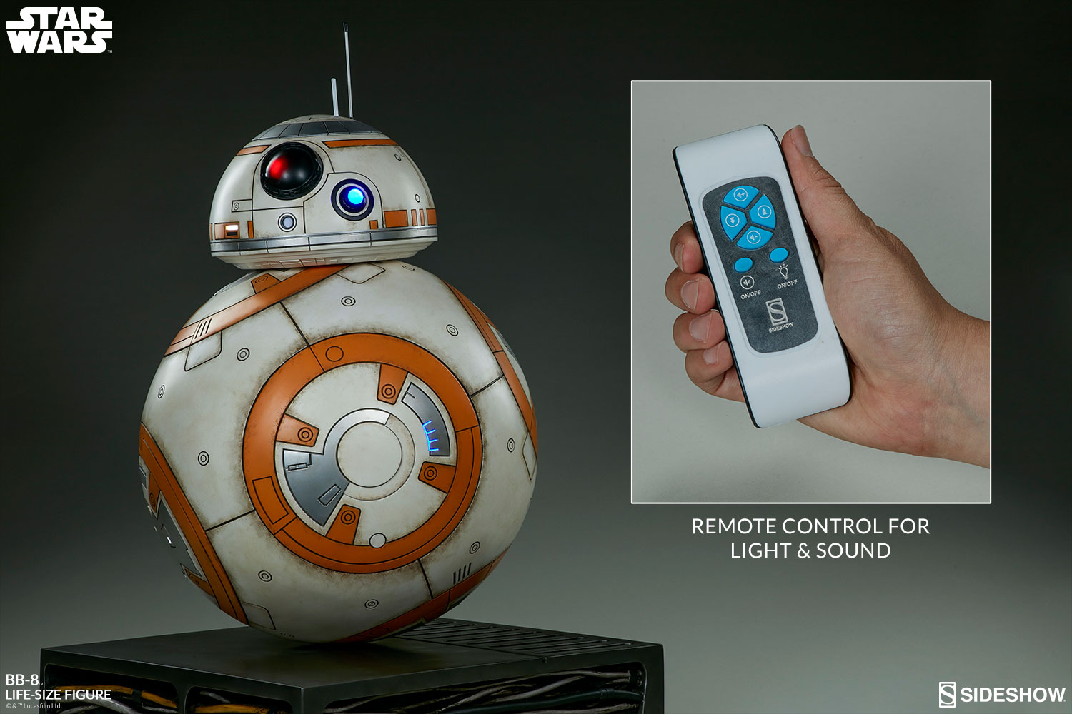 The BB-8 Life-Size Figure can be activated to display lights in the body and head, and the figure includes a sound feature for recreating the distinct bwoops and beeps of the iconic droid. Activate these dynamic features and bring BB-8 to life with the included remote control.