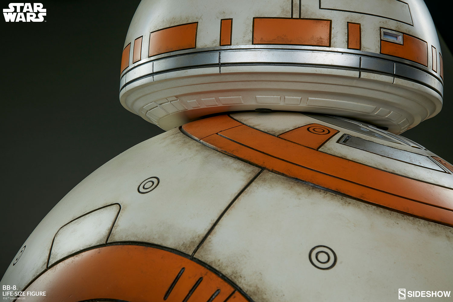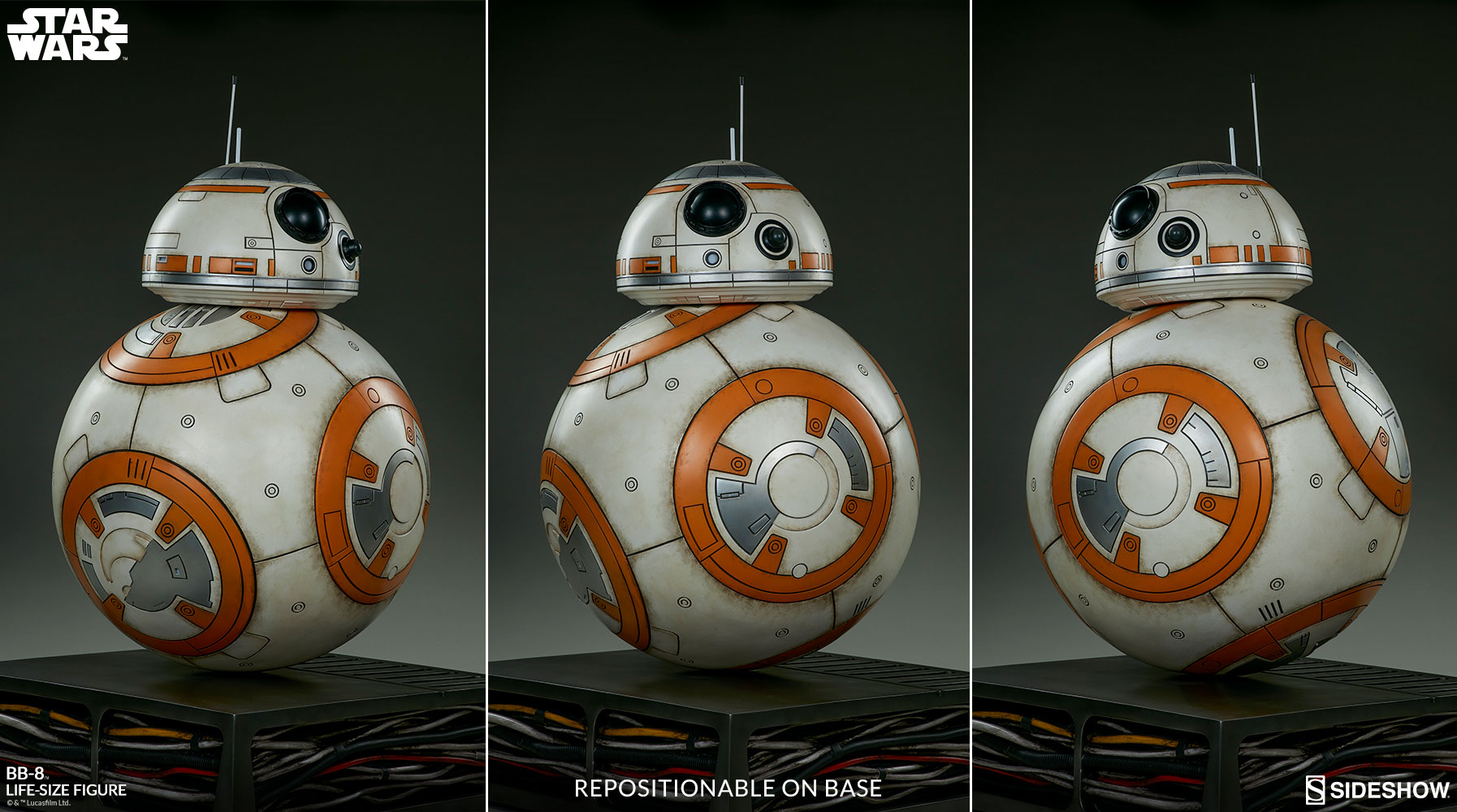 The BB-8 Life-Size Figure captures the presence of the rolling Resistance droid who came to life for fans everywhere in Star Wars: The Force Awakens. This loveable, spherical droid measures 37” tall from the bottom of the Star Wars thematic base to the top of the antennae. BB-8 is detailed with orange and silver paneling on both his round body and head, painted with weathering effects to bring all the action of the galaxy to your collection. The fiberglass astromech has a repositionable head dome, and the body can be shifted in different positions on his base.