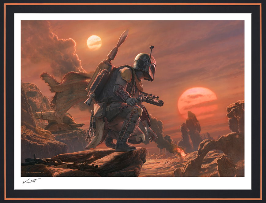 Artist Jerry Vanderstelt captures the blistering heat of a binary sunset as the iconic Boba Fett crouches on a rocky desert outcropping, his signature Slave I spaceship waiting nearby. From the bustling cityscapes of the metropolitan planets to the furthest reaches of the Outer Rim, no bounty can elude him for long. While his may be a complicated profession, Boba Fett always finds his mark, as indicated by the trophies of lightsaber hilts and Wookiee pelts he carries with him as evidence of countless successful captures. This latest bounty will be no different- Fett is prepared to take his target dead or alive.