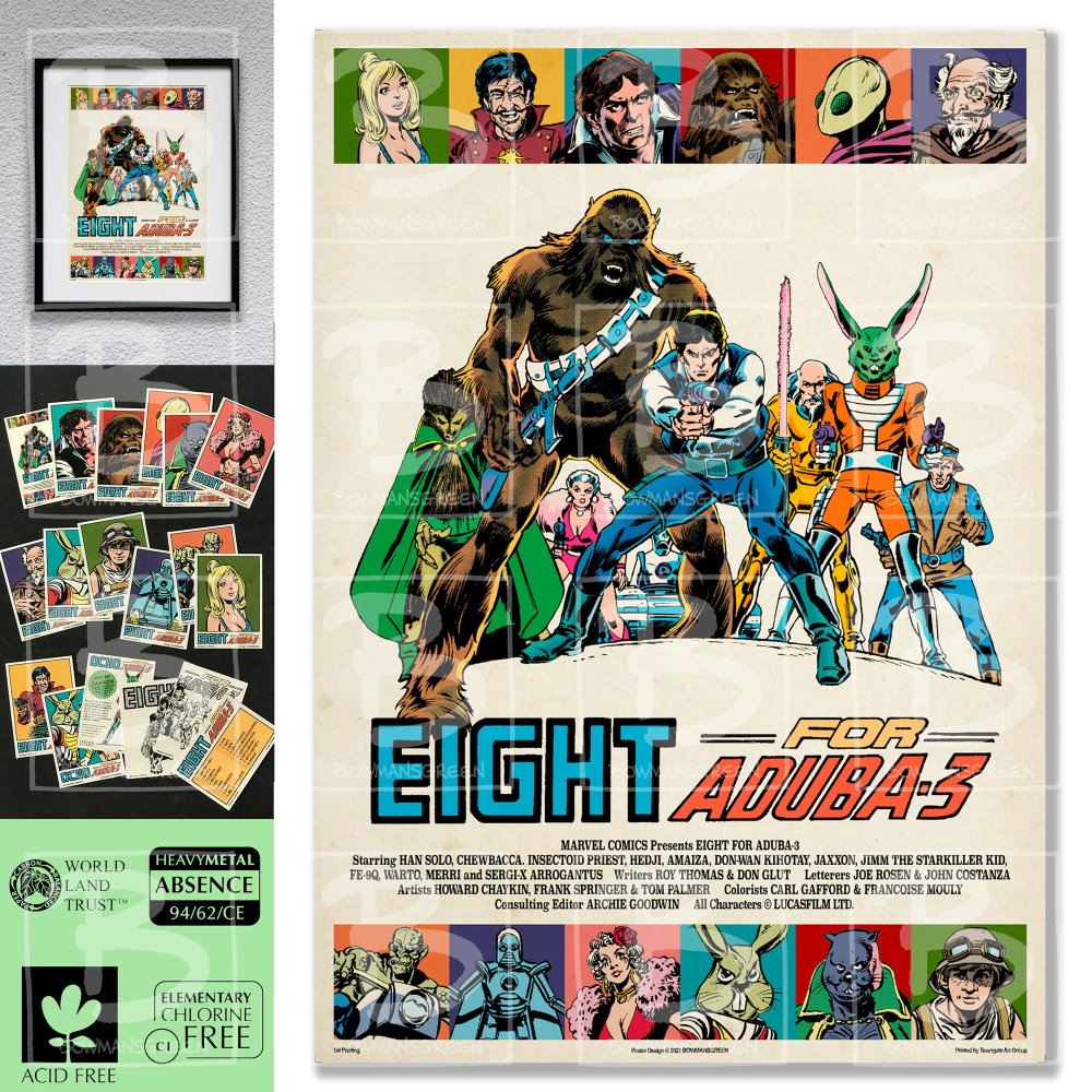 Celebrating the nostalgiafest of 1978 Star Wars content, when the galaxy was beginning to expand and reveal more of the GFFA than what we’d seen on the screen comes this, ‘Eight For Aduba-3‘ from Bowmansgreen in the style of a Spanish movie poster and a selection of 18 trading cards.