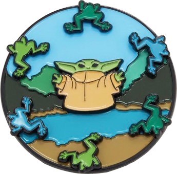 $14.90 and available at BoxLunch now, this is The Mandalorian Grogu with Frogs Spinning Pin, feeding young – well, fifty-year-old – Jedi their much-needed one-eyed amphibian snacks everywhere.