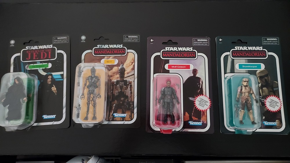Next, four Vintage Collection figures including Carbonised Shore Trooper and Carbonised Moff Gideon and regular The Emperor and IG-11.