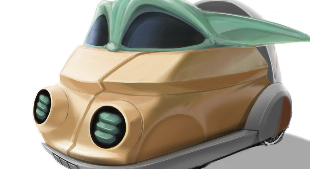 Charlie Angulo: In this case, throughout the show, we see the Child in this hover pram for the most part. It’s almost an essential part of the character as it gives many traits to the Child. It shows that the Child needs protection, safety, and that it needs help transporting itself, so it’s assumed to be fragile and innocent. Having the pram included actually helps us define its traits and complete the character. Plus, fans are so used to seeing the Child in the pram that it is expected to be a part of the design.