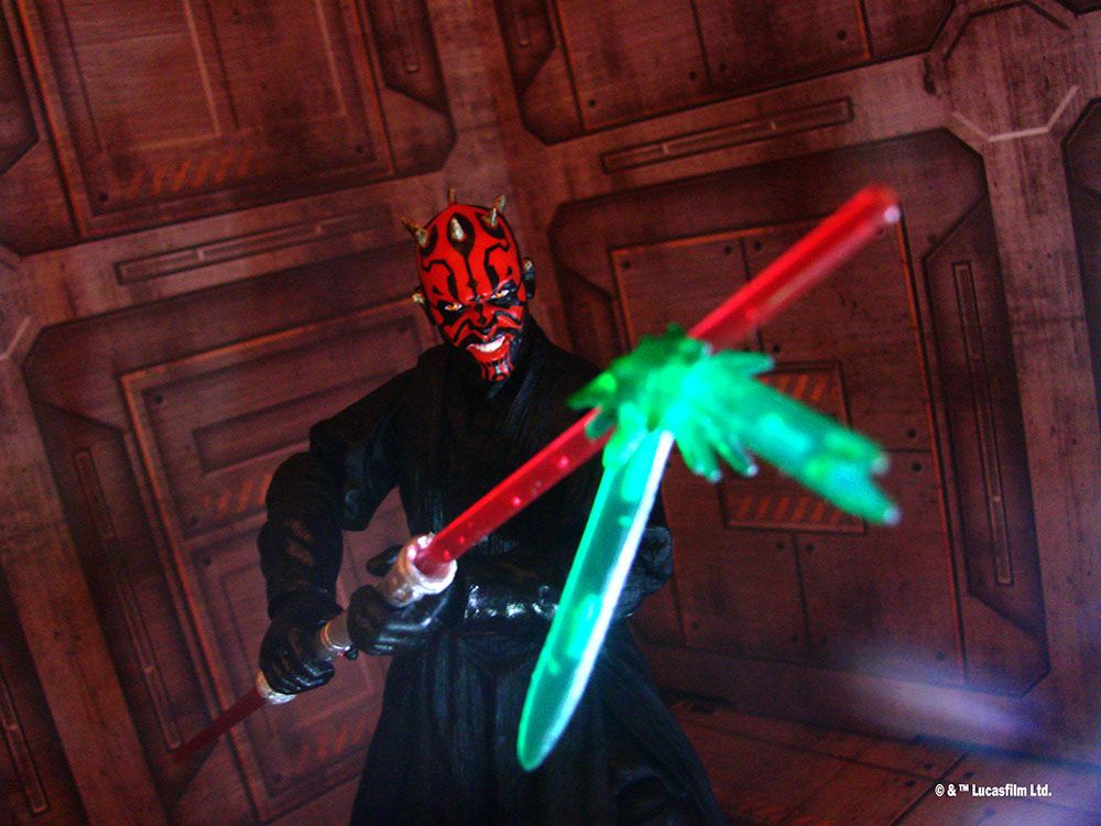 Darth Maul, one of history’s deadliest Sith Lords, wields a twin-bladed lightsaber with removable blades, twirling blades and a removable connector peg for double lightsaber action, and also includes alternate hands and a deflecting laser effect.