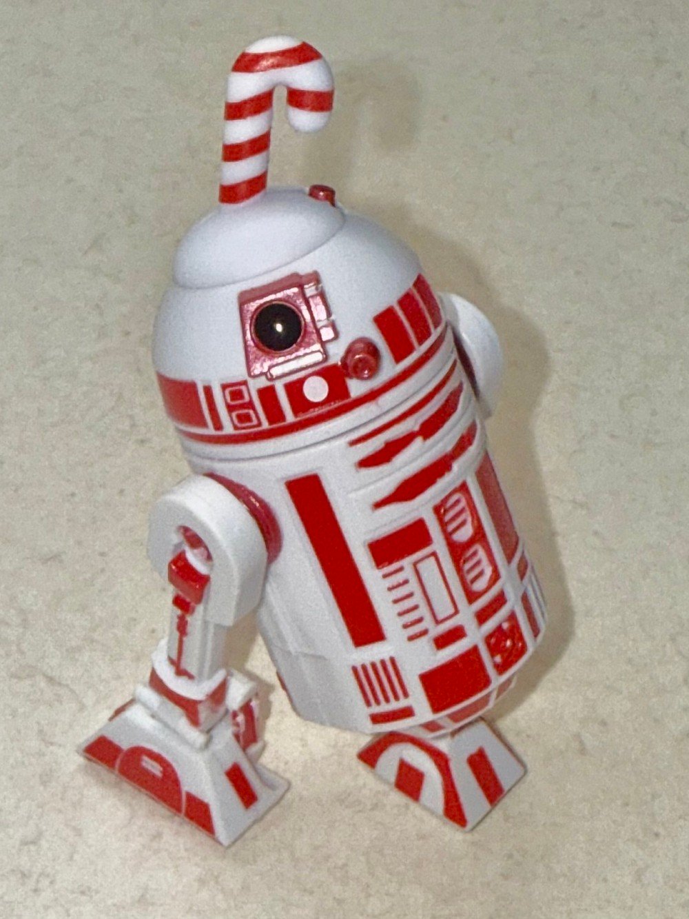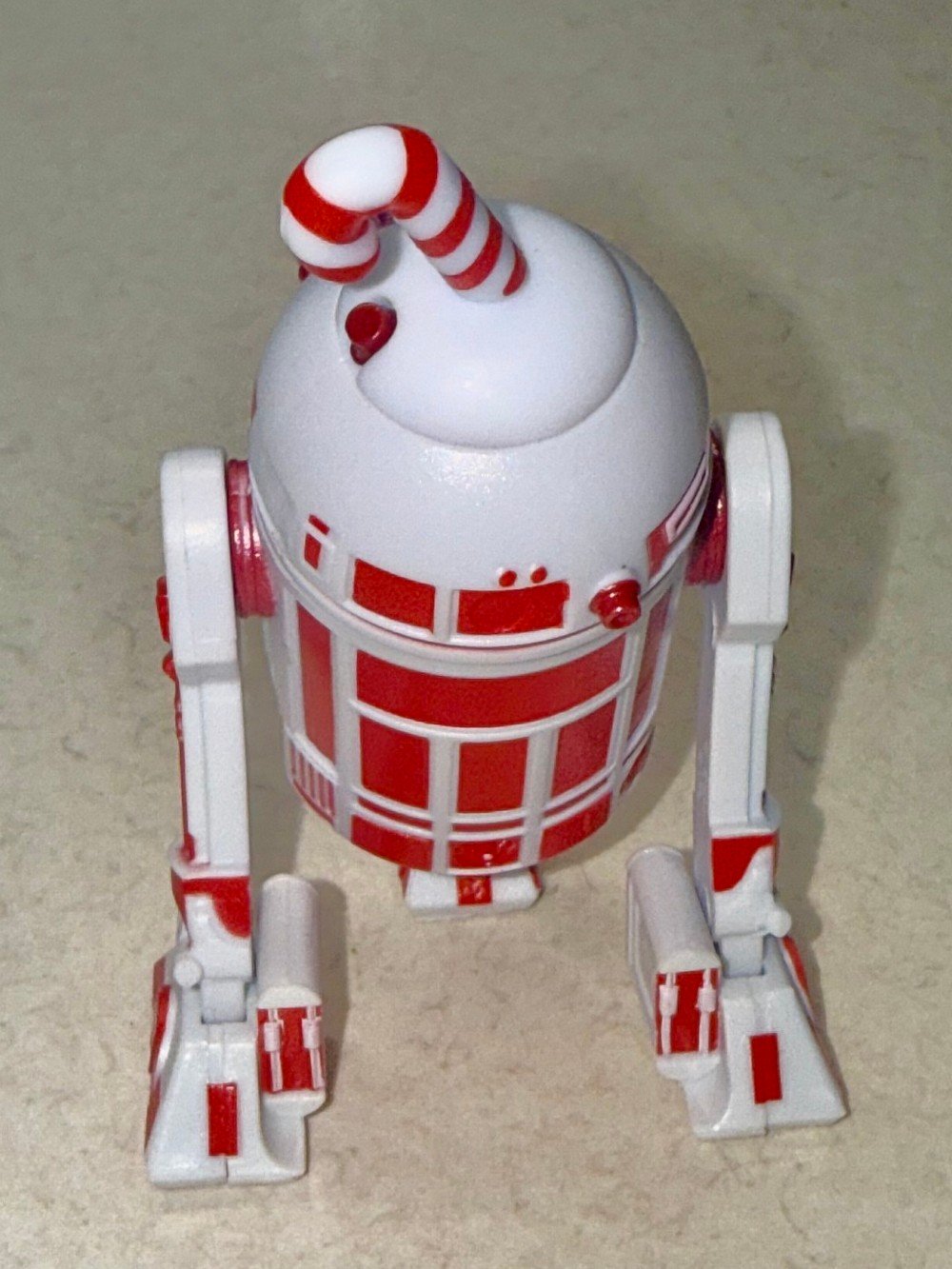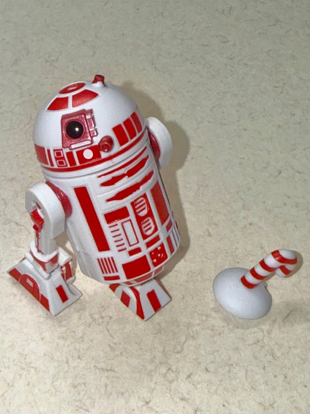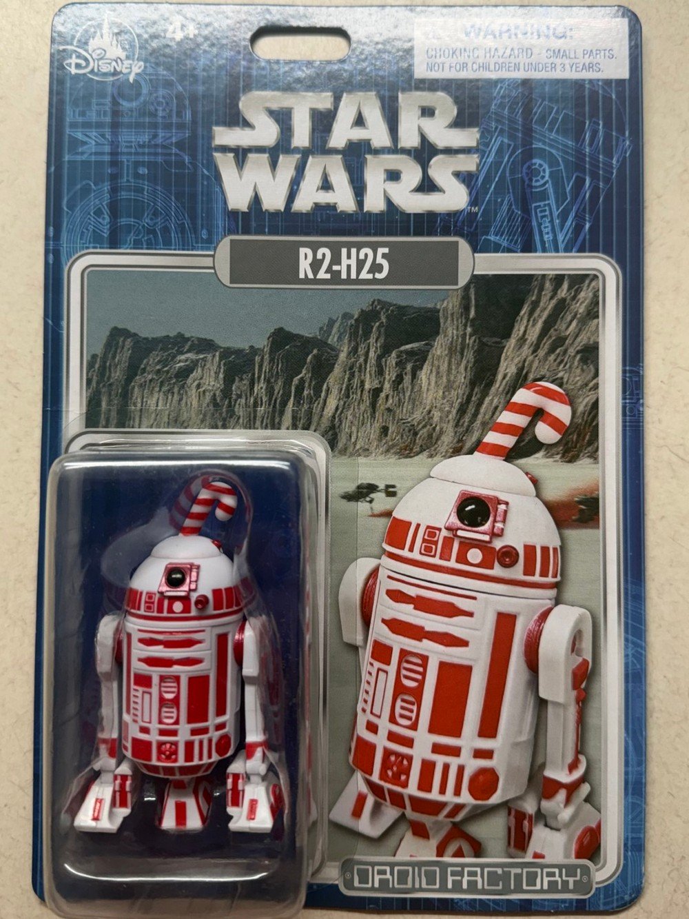 Take a in-hand look at R2-H25, this year’s Disney Parks Holiday themed Droid Factory astromech. Featuring the classic R2 series dome design, with a festive red and white colour scheme, inspired by a candy cane, with an accompanying candy cane ‘hat’ accessory.