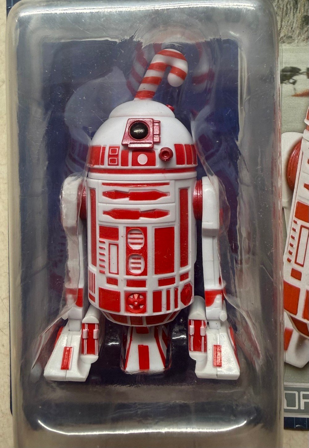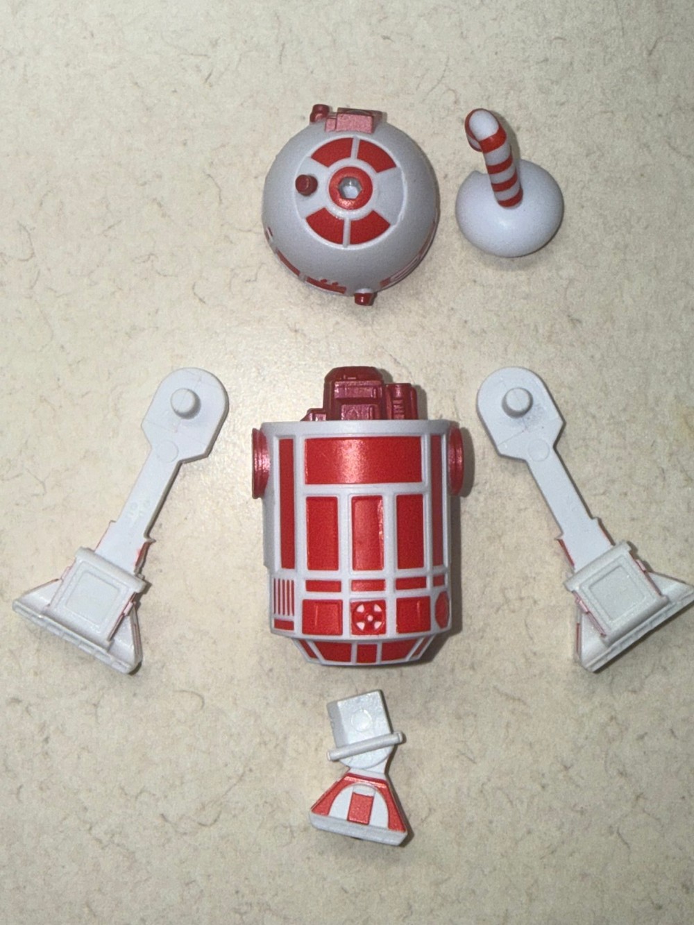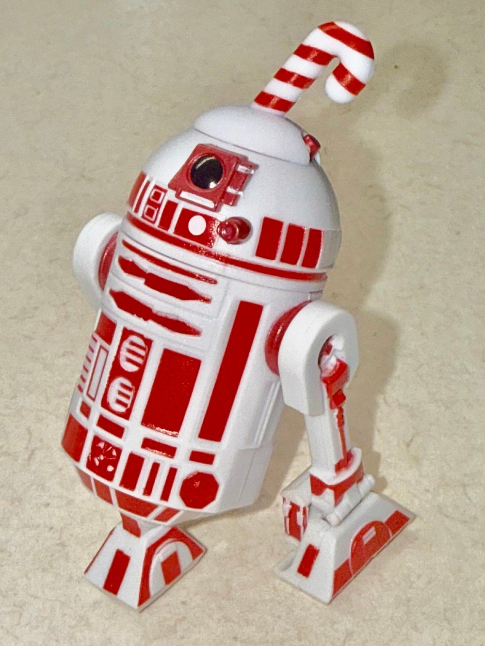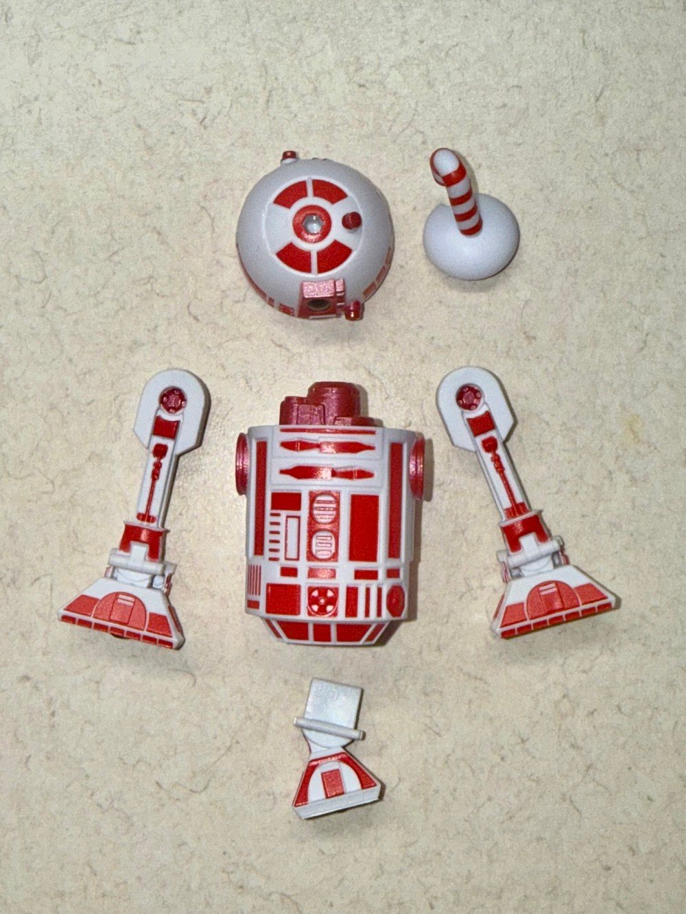Take a in-hand look at R2-H25, this year’s Disney Parks Holiday themed Droid Factory astromech. Featuring the classic R2 series dome design, with a festive red and white colour scheme, inspired by a candy cane, with an accompanying candy cane ‘hat’ accessory.
