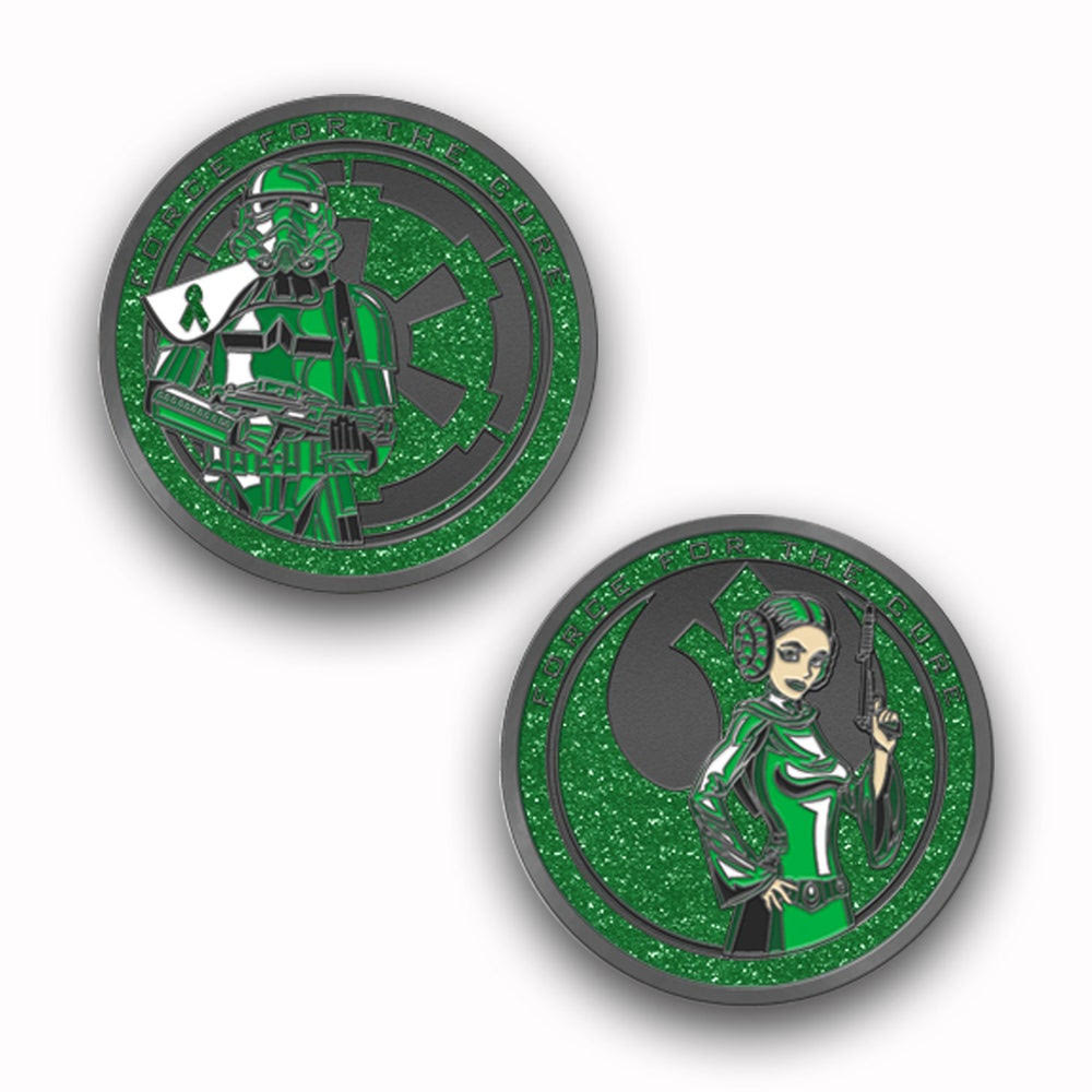 1.5″ Metal Challenge Coin featuring the The Force For The Cure Logo with Green Glitter Enamel on Black Metal!