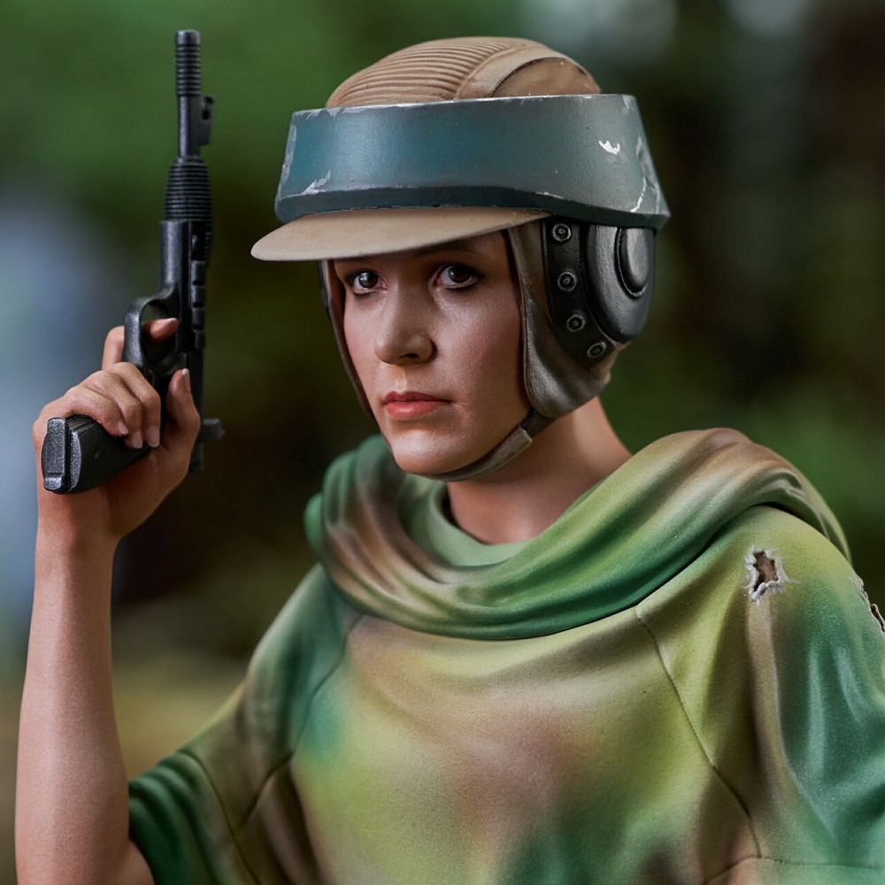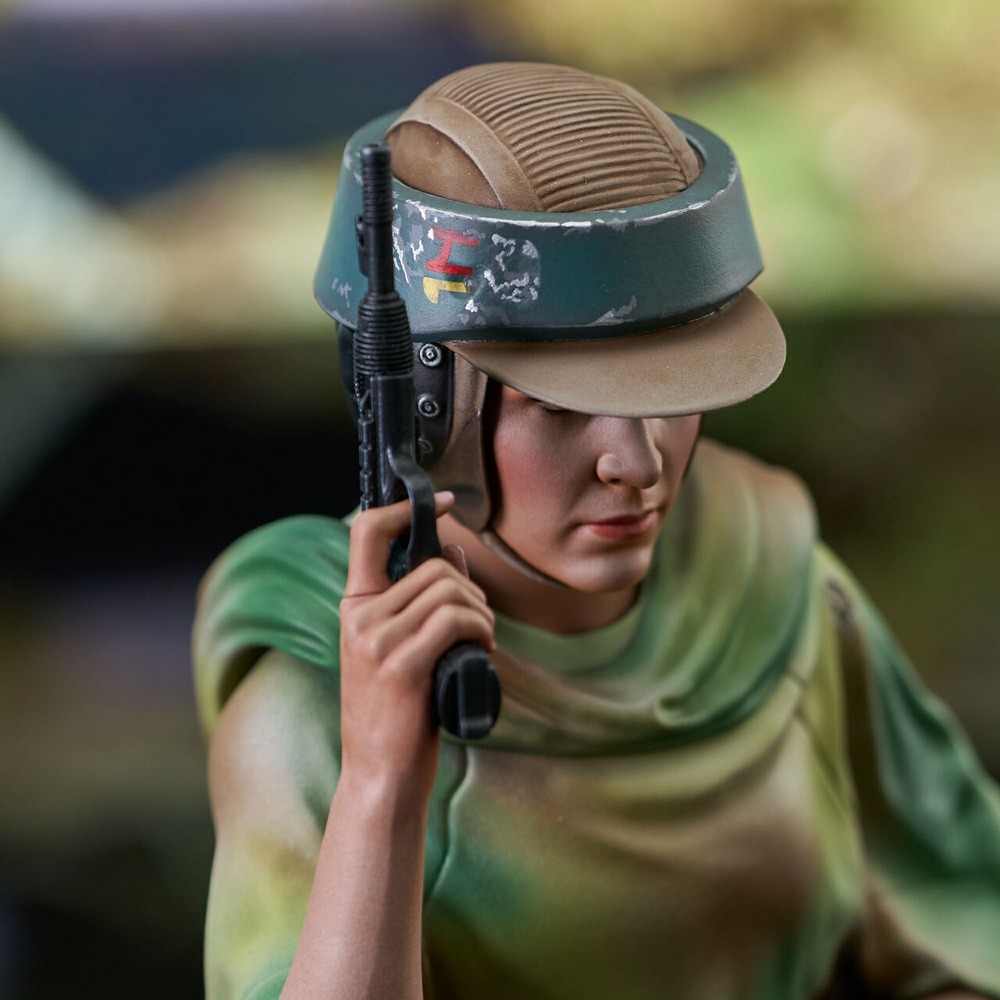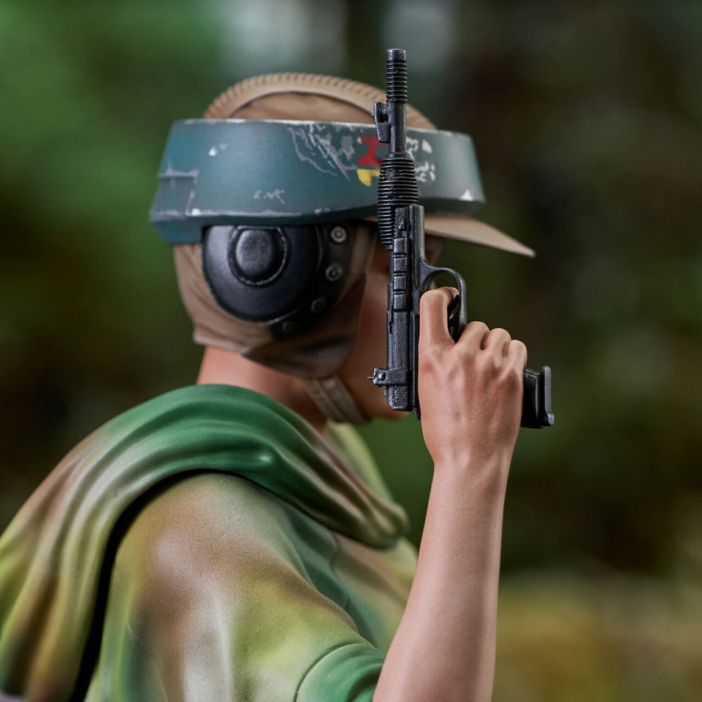 Wearing her helmet and camouflage poncho, Leia holds her blaster at the ready in this approximately 6-inch tall, 1/6 scale mini-bust.