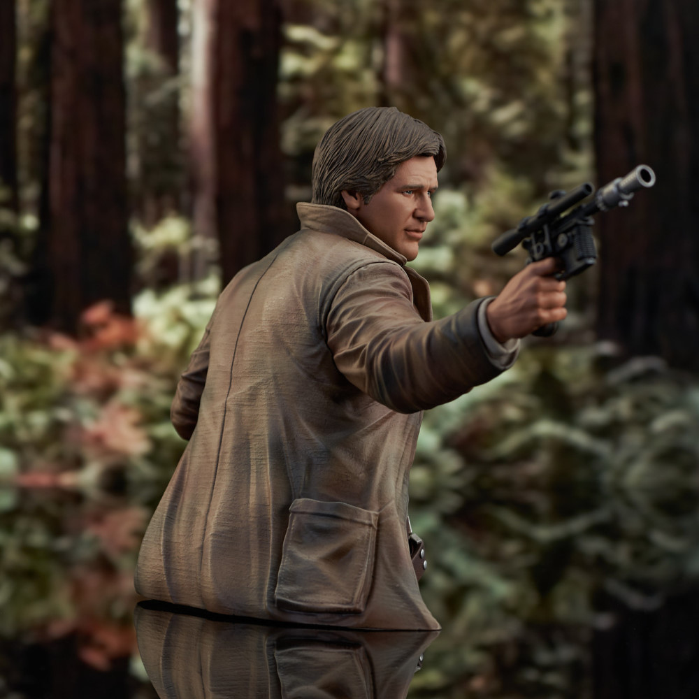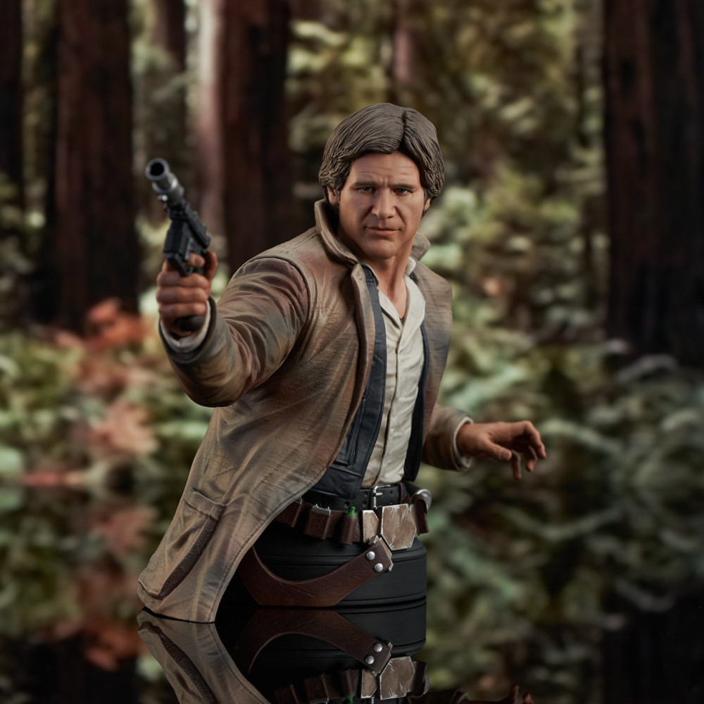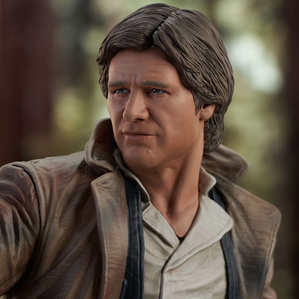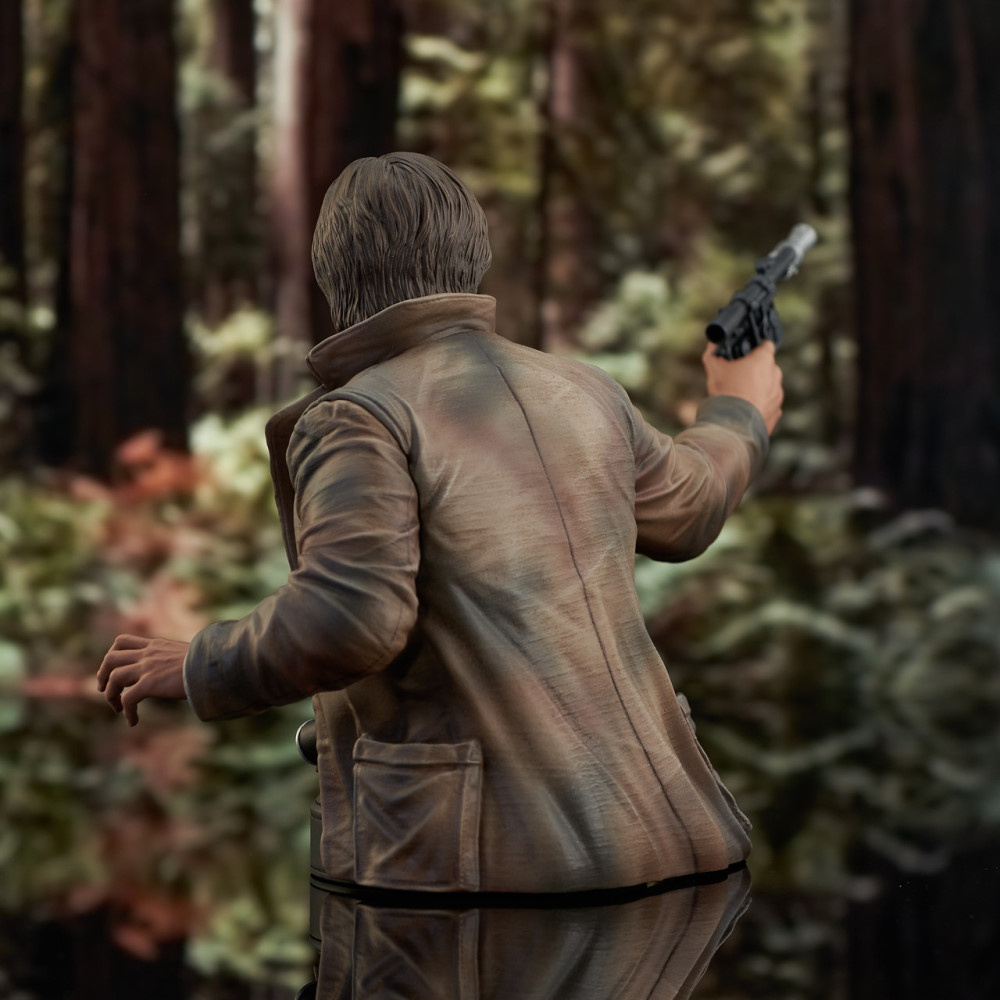 To celebrate the 40th anniversary of Star Wars: Return of the Jedi, Gentle Giant LTD is returning to the forest moon of Endor to capture Han Solo in one of his most distinctive outfits! Wearing his camouflage trenchcoat from the Endor battle scene, Han Solo holds his trusty blaster and wears his trusty smirk in this all-new 1/6 scale mini-bust.