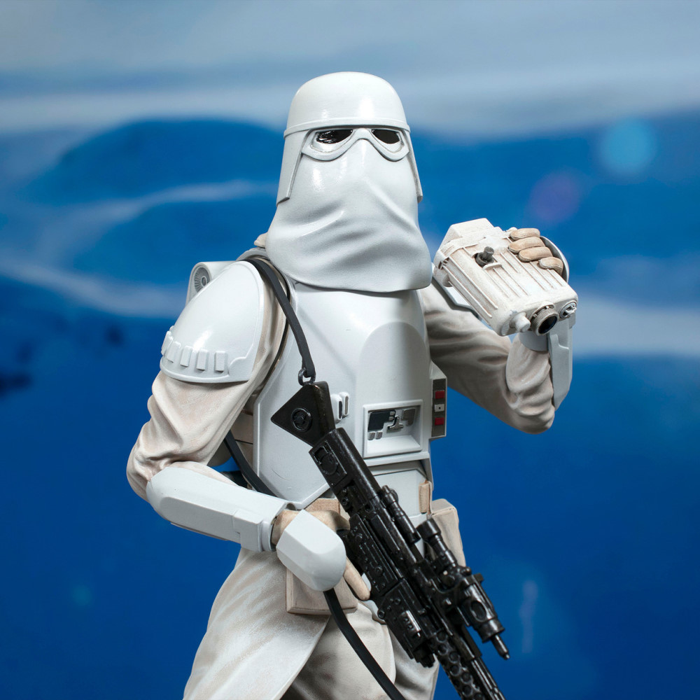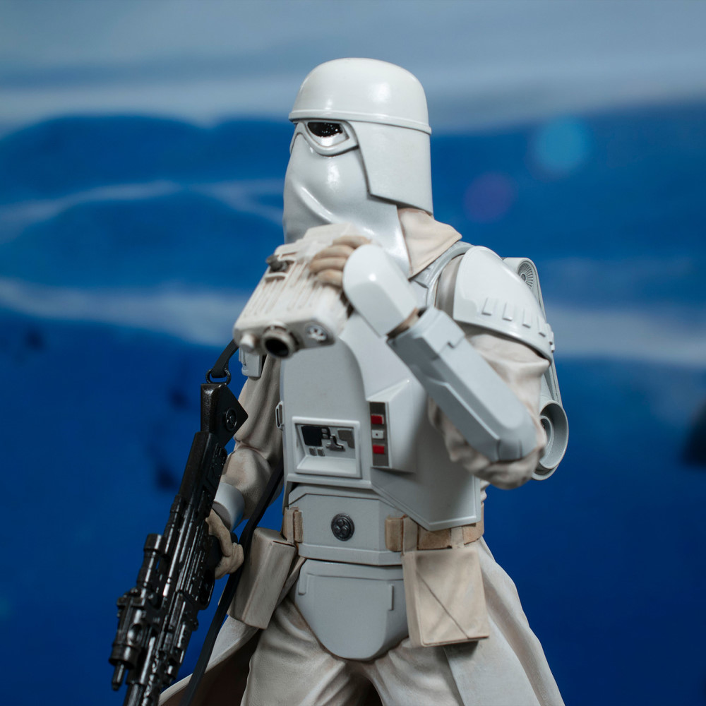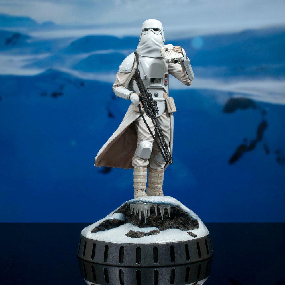 The Snowtroopers are on the hunt for Rebels, and they may have found some! Standing on a snowy, rocky landscape, this 1/6 scale statue of an Imperial Snowtrooper holds a pair of binoculars in his hand and a rifle at his side, while his uniform flaps in the wind. Measuring approximately 13 inches tall, this resin sculpture features detailed sculpting and paint applications. It is limited to only 1,000 pieces and comes packaged with a numbered certificate of authenticity in a full-color window box