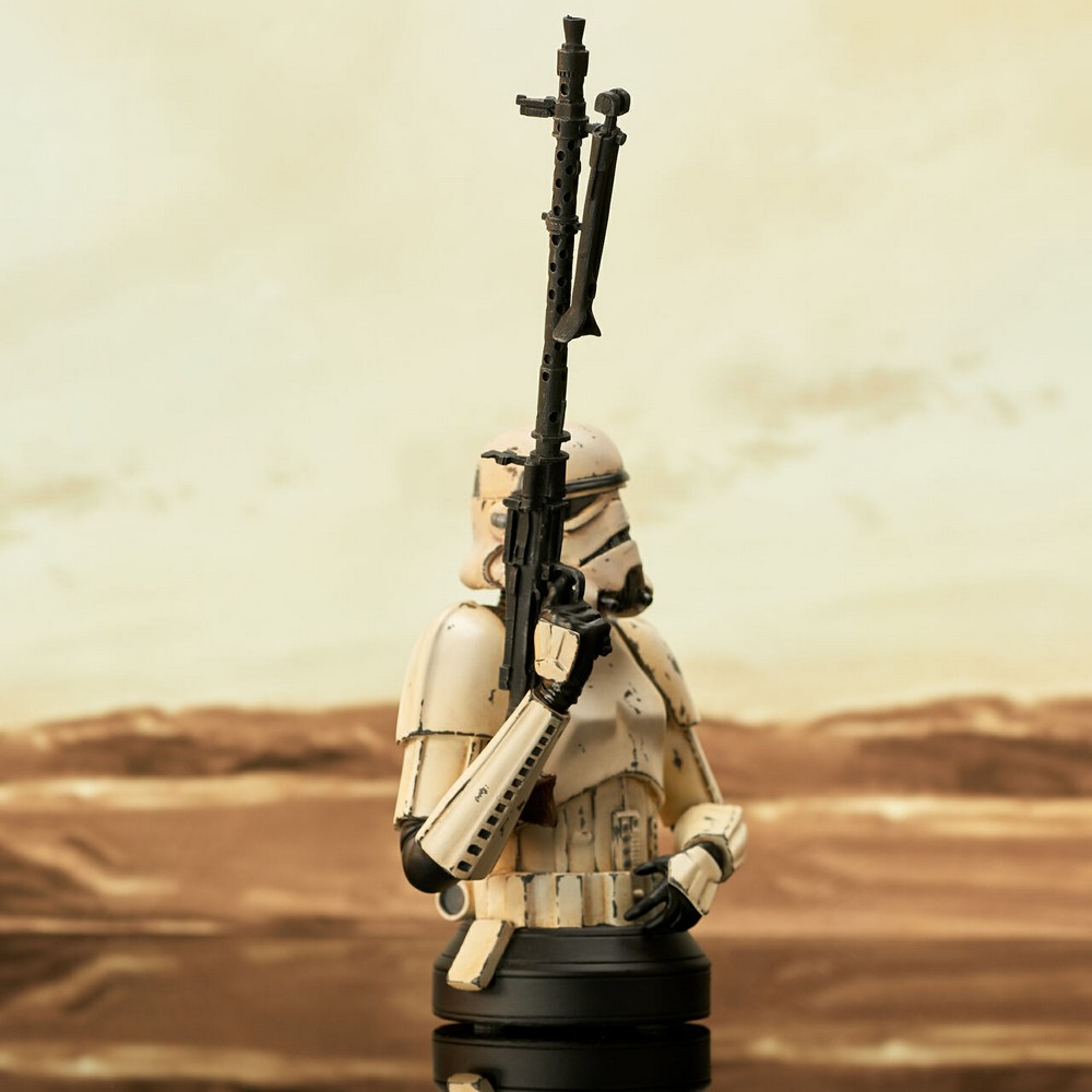 This 1/6 scale, approximately 6-inch mini-bust of a battle-scarred Remnant Stormtrooper includes interchangeable arms holding an E-11 blaster and a DLT-19 heavy blaster rifle.