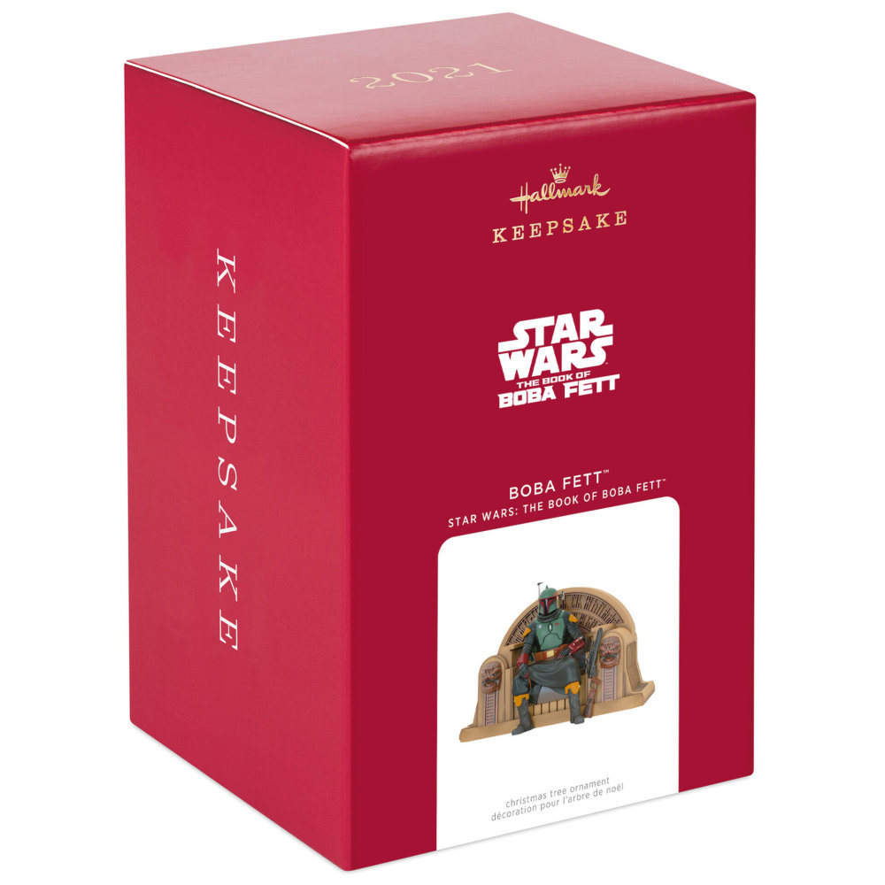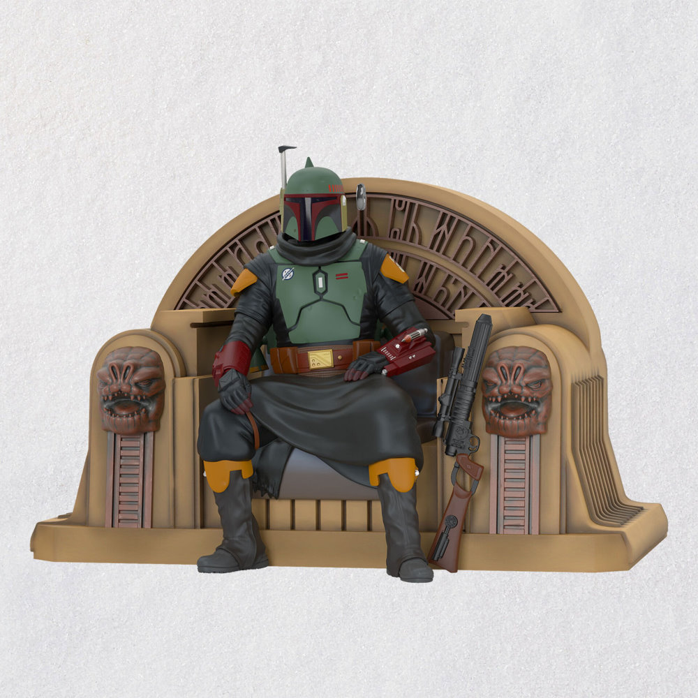 A self-proclaimed “simple man making his way through the galaxy” (like his father before him), Boba Fett endures as one of the most infamous bounty hunters in Star Wars lore. After falling into the belly of the Sarlacc, his reappearance in season 2 of The Mandalorian thrilled fans—even more so as he returned to Jabba the Hutt’s palace on Tatooine and usurped the throne held by Bib Fortuna. This Christmas tree ornament depicts that triumphant moment, which teased the upcoming arrival of The Book of Boba Fett.