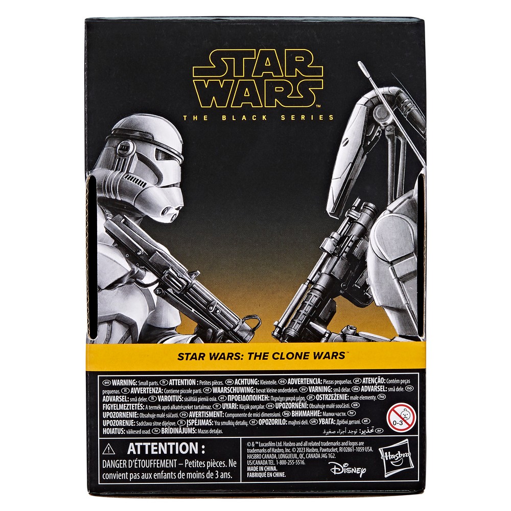 STAR WARS fans and collectors can imagine scenes from the STAR WARS galaxy with this premium 6-inch STAR WARS: THE BLACK SERIES CLONE TROOPER & BATTLE DROID pack, inspired by the characters’ appearances in the STAR WARS: THE CLONE WARS. For the first time in THE BLACK SERIES, fans can imagine epic battles inspired by The Clone Wars with this troop building pack. Fans and collectors can display these fully articulated figures featuring premium detail and multiple points of articulation in their collection. Includes 2 figures and 5 entertainment-inspired accessories including 2 blasters and a removable helmet for the clone trooper. The battle droid includes a removable backpack, antenna, and blaster accessory.