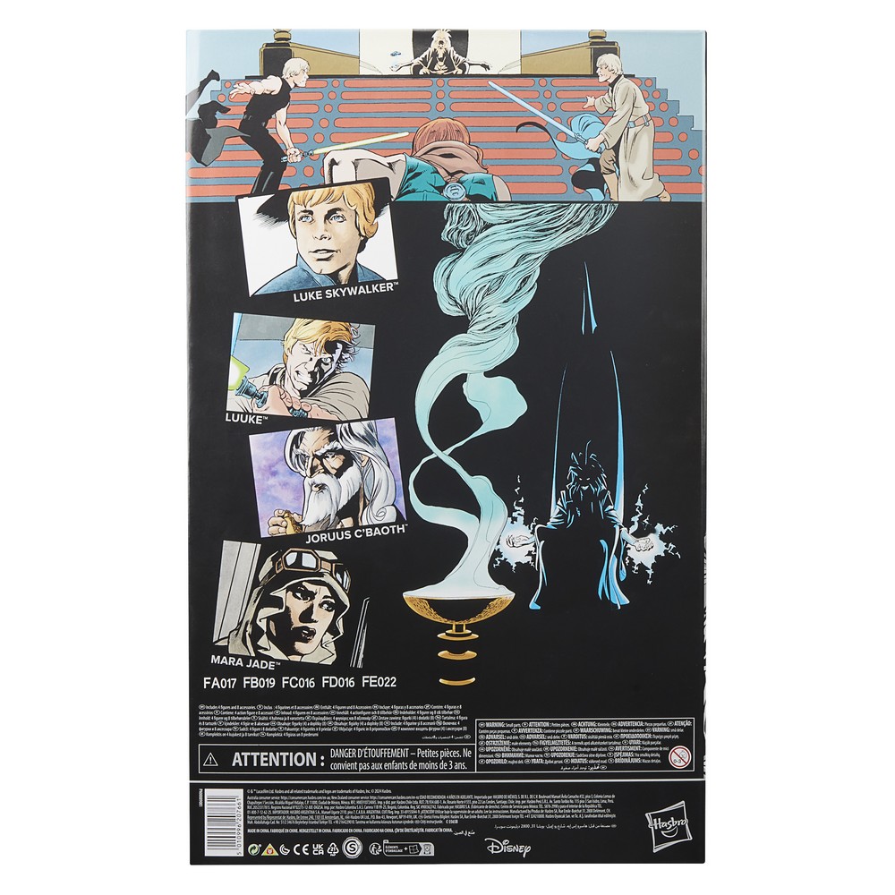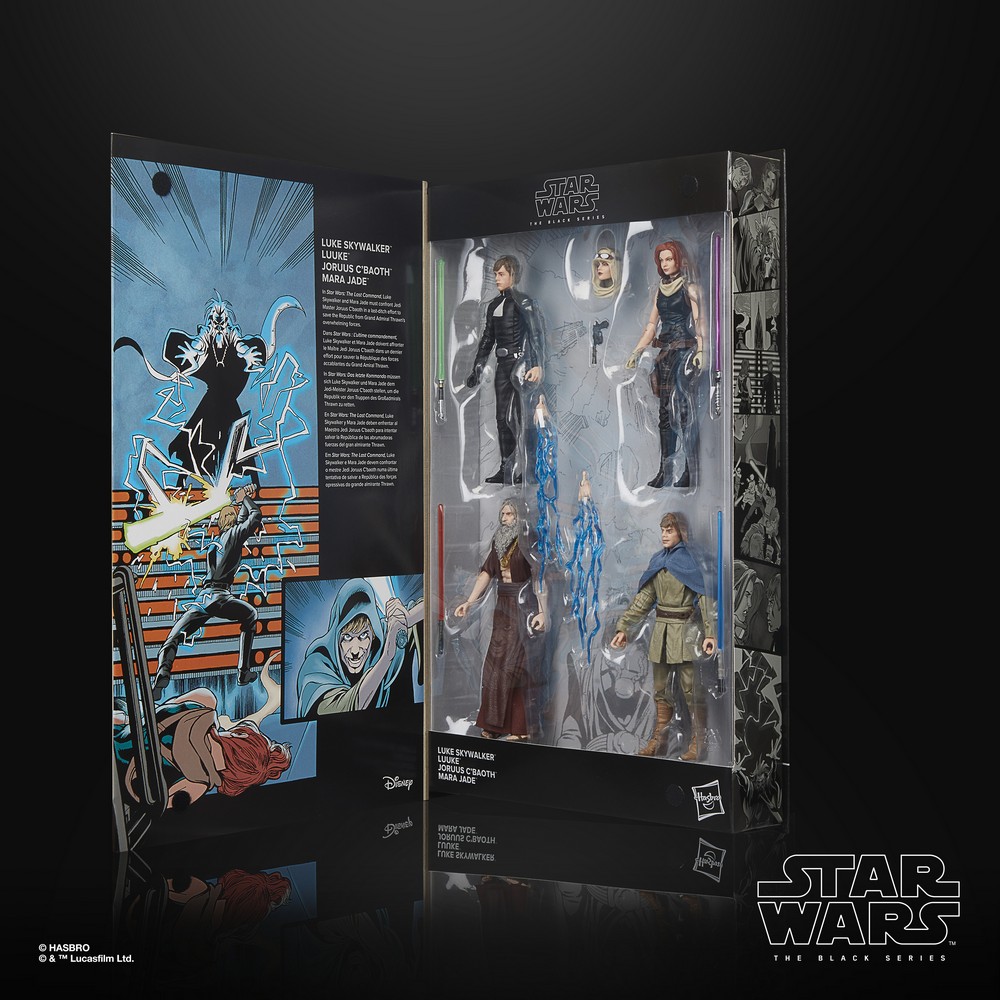 STAR WARS fans and collectors can imagine scenes from the STAR WARS galaxy with this premium 6-inch STAR WARS: THE BLACK SERIES STAR WARS: THE LAST COMMAND 4-pack, inspired by the characters’ appearances in the STAR WARS: THE LAST COMMAND comic books. Luke Skywalker and Mara Jade must confront Joruus C’baoth in a last ditch effort to save the Republic from Grand Admiral Thrawn’s overwhelming forces. The characters included in the pack include Luke Skywalker, Luuke, Joruus C’baoth and Mara Jade. Fans and collectors can display these fully articulated figures featuring premium detail and multiple points of articulation in their collection. Includes 4 figures and 8 comics-inspired accessories including 4 Lightsabers, 2 lightning hands for Joruus C’baoth and an alternate head and blaster for Mara Jade.
