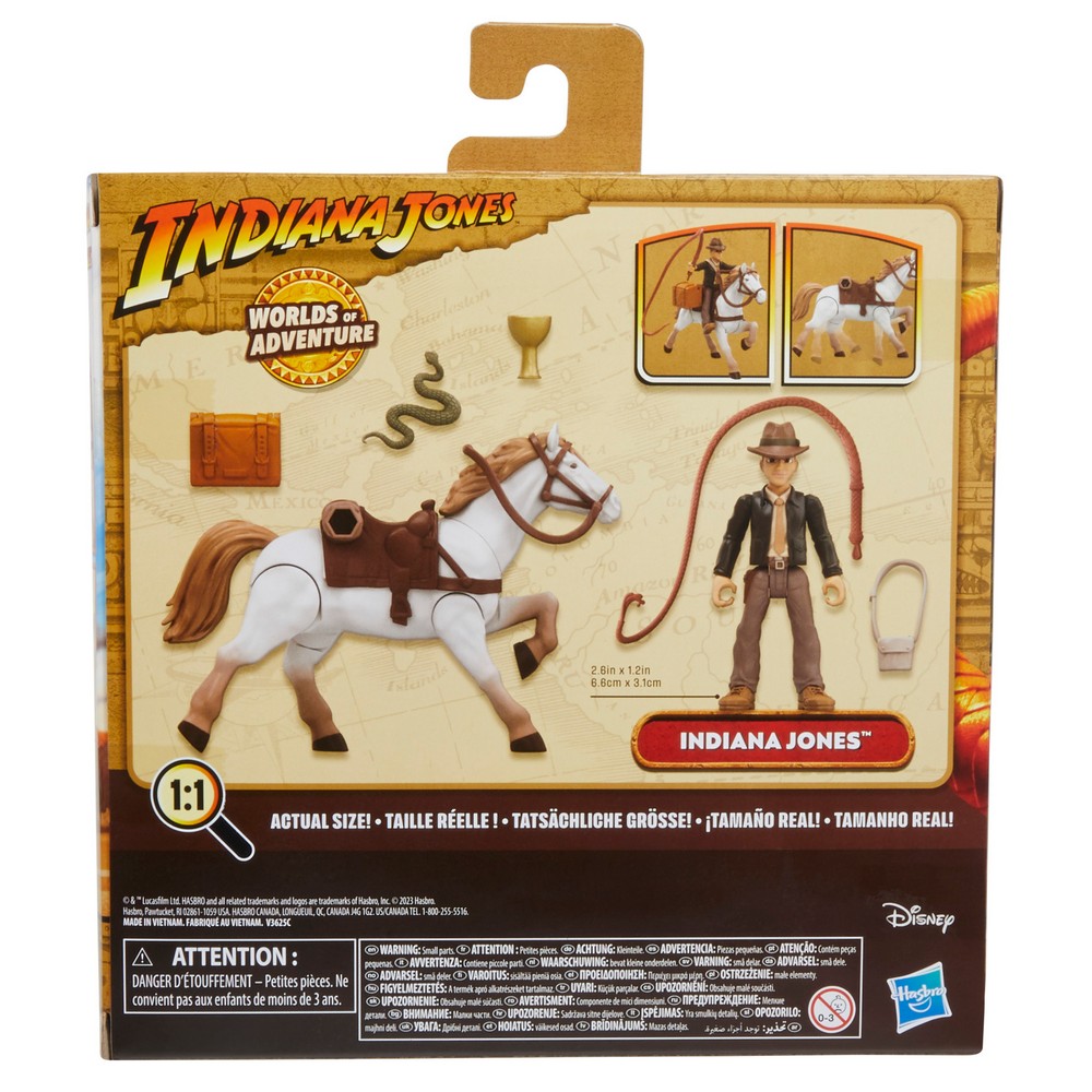 Gallop into heart-stopping action with the Indiana Jones Worlds of Adventure Indiana Jones with Horse 2-pack! This 2.5-inch-scale Indiana Jones action figure features fully poseable arms, legs, and head, as well as design and detail inspired by the Indiana Jones entertainment. Kids ages 4 and up will love re-creating favorite Indiana Jones moments with this Indiana Jones gift set, featuring snake, Holy Grail, satchel, and whip accessories, as well as a repositionable saddlebag!