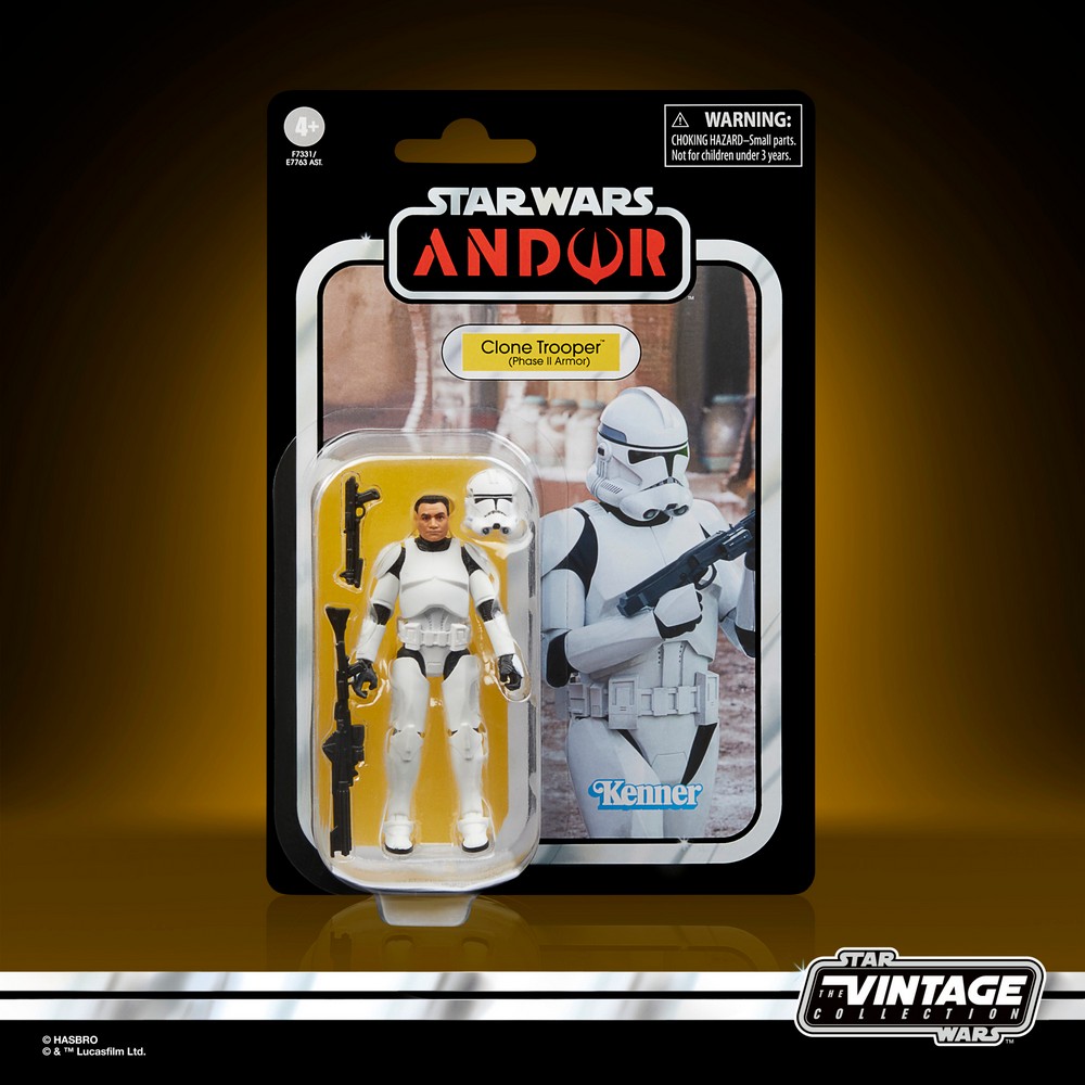 Fans can celebrate the legacy of STAR WARS, the action-and-adventure-packed space saga from a galaxy far, far away, with this premium 3.75-inch scale PHASE II CLONE TROOPER figure inspired by the character in the STAR WARS: ANDOR live-action series. In an era filled with danger, deception, and intrigue, Cassian Andor embarks on a path that will turn him into the rebel hero who will challenge the evil Galactic Empire. The figure features premium detail and design across product and packaging inspired by the original Kenner line, as well as the entertainment-inspired collector grade deco. Includes figure and 3 entertainment-inspired accessories, including a removable helmet.