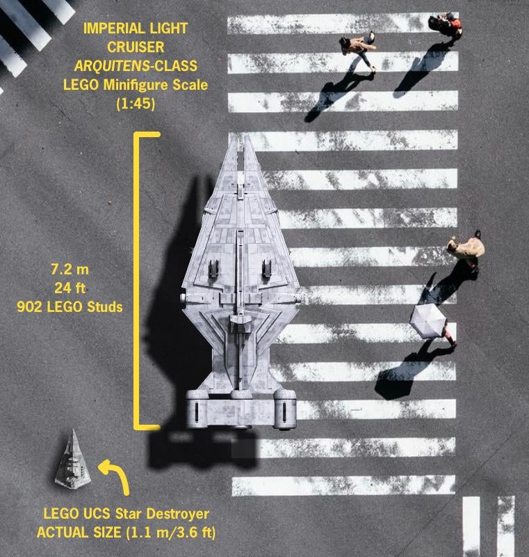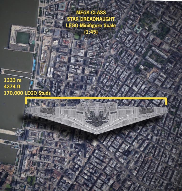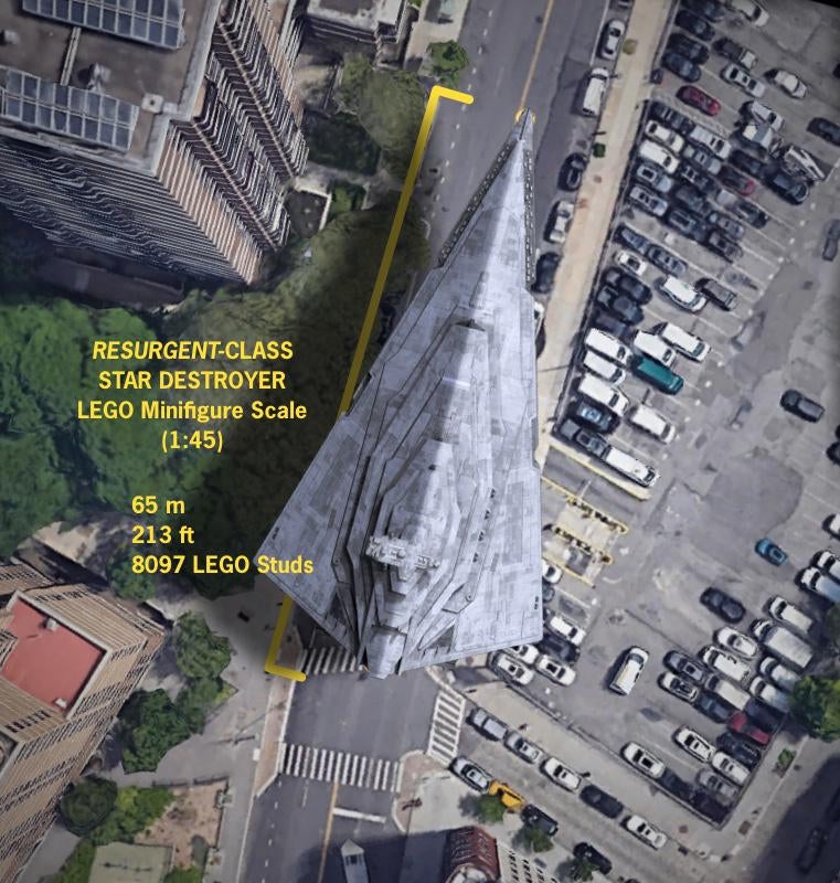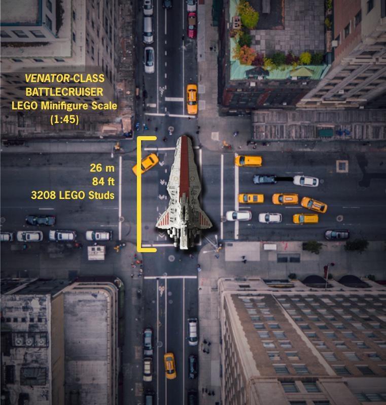 A Venator-class Star Destroyer at 1:45 scale – the size determined closest to minifigure-scale, based on the height of a single minifigure, by Geroditus – would apparently come in at 3,208 studs long. That’s roughly 26 metres (or 84 feet).