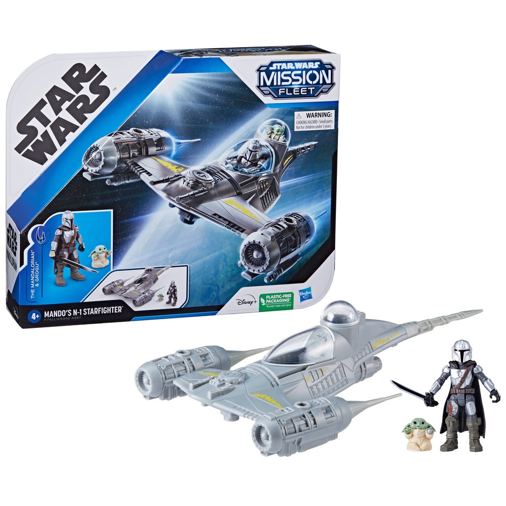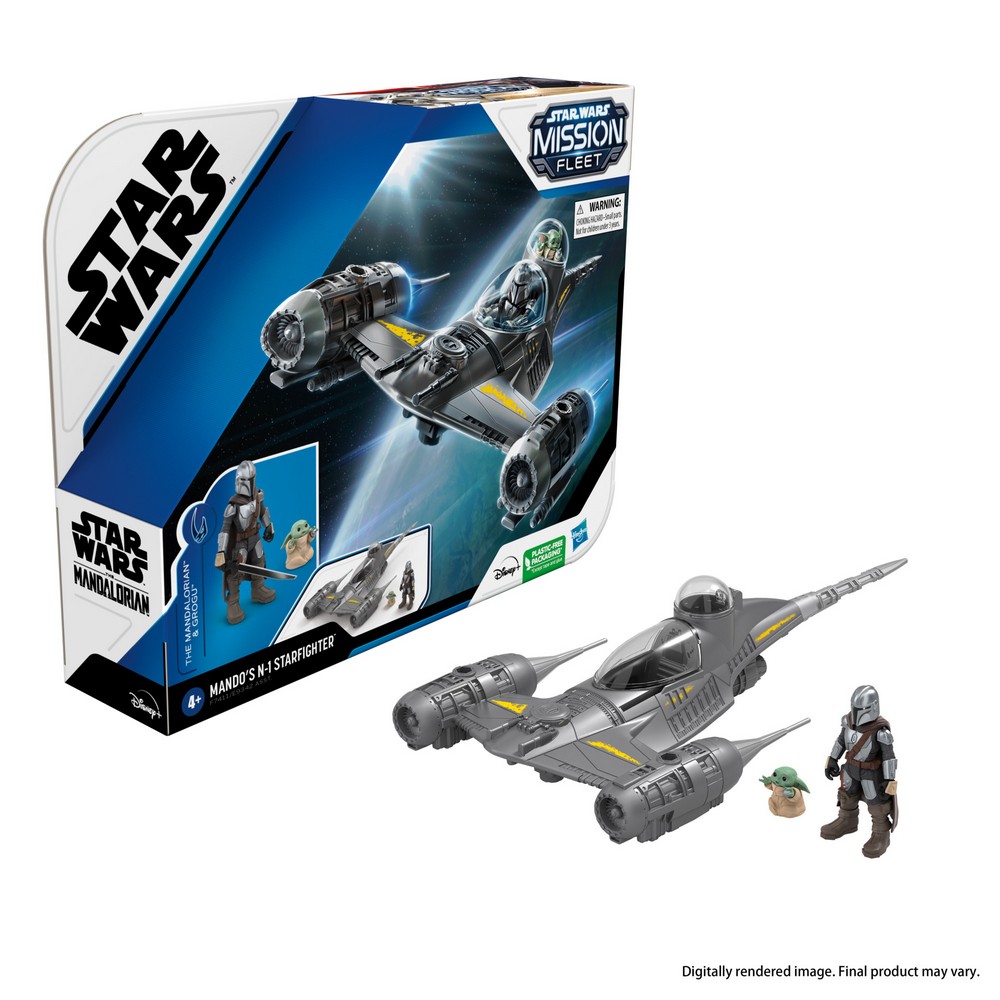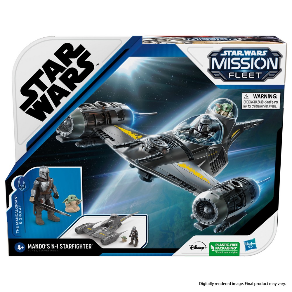 Blast off into galactic action with the Star Wars Mission Fleet Mando’s N-1 Starfighter Grogu & Mandalorian action figure set. This Star Wars toy includes a 2.5-inch-scale Mandalorian figure with fully poseable arms, legs, and head, as well as design and detail inspired by The Mandalorian live-action series on Disney+. This Mission Fleet Star Wars playset also comes with a Darksaber accessory and Grogu figure, affectionately referred to as “Baby Yoda” by fans. This Star Wars set comes with The Mandalorian’s N-1 Starfighter ship, featuring series-inspired design, an opening cockpit for the Mandalorian toy, and a hatch where Grogu can sit. Place the Mandalorian action figure in the cockpit of the N-1 Starfighter and the Grogu toy inside the hatch to imagine speeding through the galaxy.