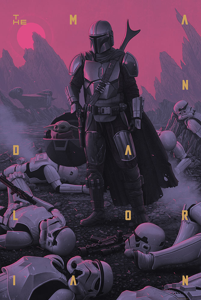 This variant print features a stunning image of Mando and the Child in the center of a whole legion of defeated stormtroopers.