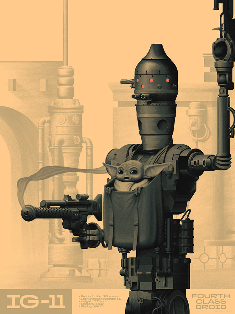 He may be a fourth class droid, but IG-11 is a first class caretaker for The Child, seen here strapped to the droid’s chest in an all-new, limited-edition print.