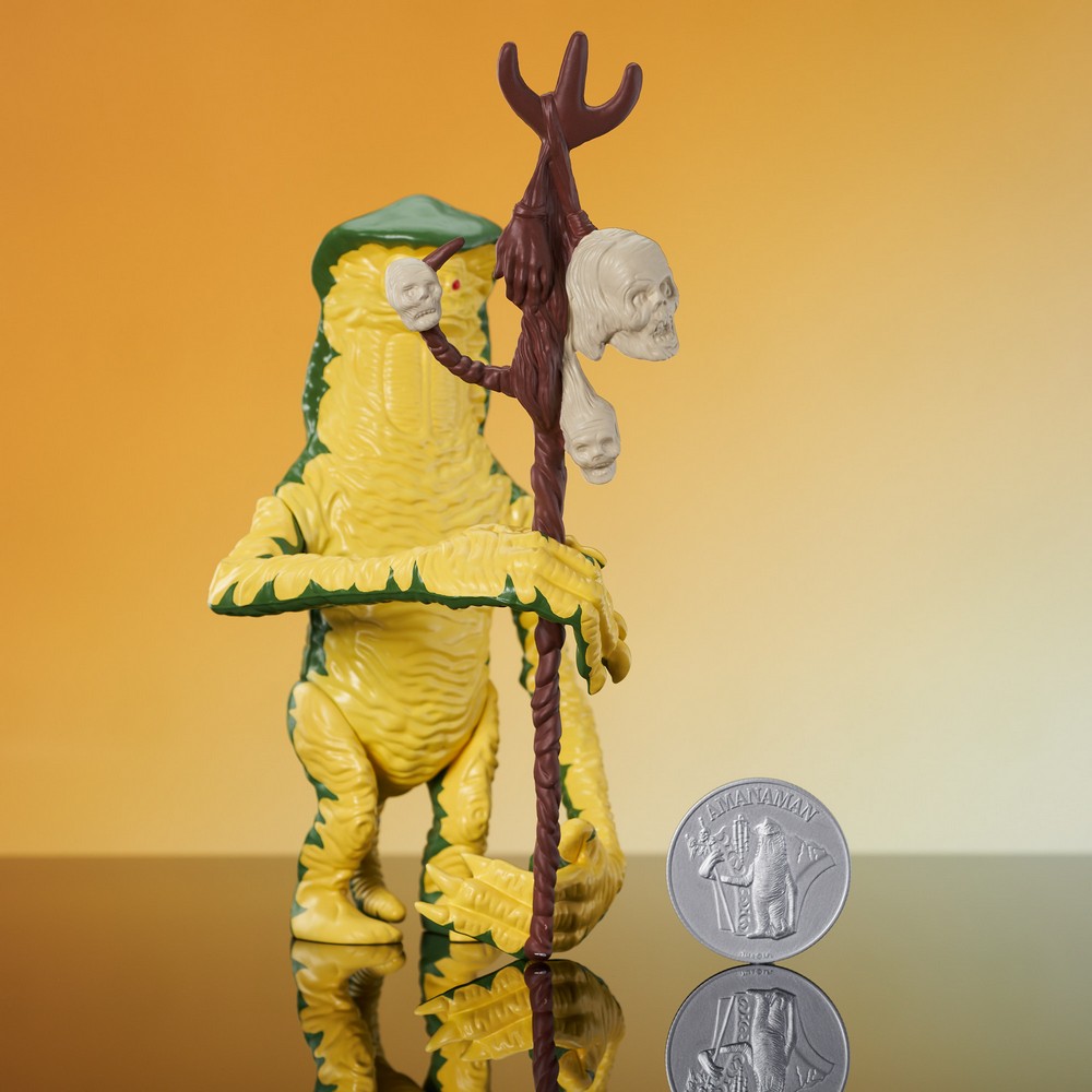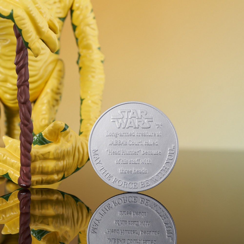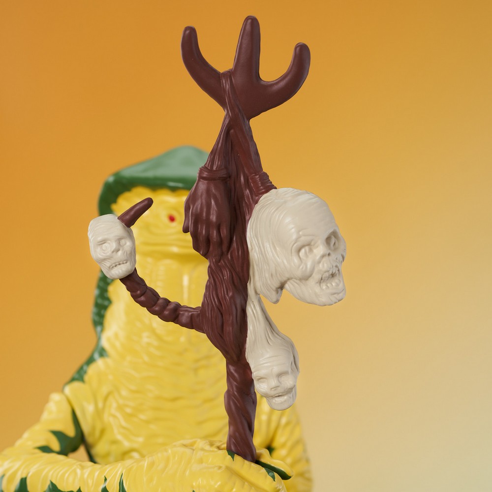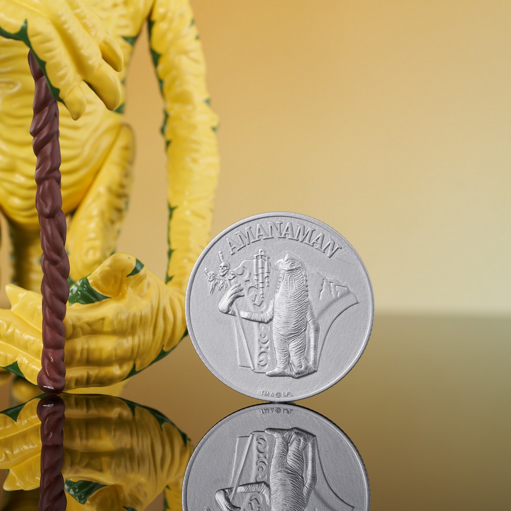 And the other is Amanaman, the alien headhunter seen in Jabba the Hutt’s palace in Return of the Jedi. This Jumbo 12-Inch Retro Figure — based on the vintage figure, one of the “original 96” — comes packaged on a large, resealable blister card with a vintage-style cardback, his staff decorated with skulls and a Power of the Force coin. Just like back in 1985!