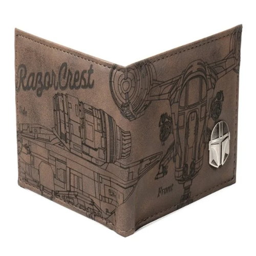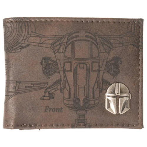 Entertainment Earth Exclusive! Whether you’re engaging in cosplay or just need to freshen up your wallet game, this sensational Star Wars: The Mandalorian Etched Print PU Bifold Wallet should do the trick. Made of brown PU, it features a black etched image of Mando’s Razor Crest ship and a metal embellishment of his helmet on the exterior. Inside, you’ll find 3 card slots, a window ID slot, and a bill compartment. The wallet comes packaged in an open window box and measures approximately 4 1/4-inches wide x 3 1/4-inches tall x 3/4-inch thick when closed. When open, it measures about 8 1/4-inches wide. Get yours while you can!