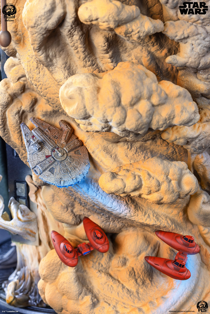 The Boba Fett – Fine Art Bust Deluxe Edition features LED light up features to add an extra sense of excitement and drama to this already staggering piece. The warm glow emanating from beneath the floors of the carbonite freezing chamber illuminates a highlight of this piece, a statue of the disquietingly stoic Boba Fett standing beside his frozen quarry.