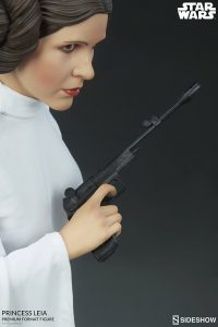 The Princess Leia Premium Format™ Figure has a lifelike portrait that has been lovingly sculpted in the indelible likeness of Carrie Fisher, complete with her iconic hair buns. As the face of hope in the galaxy, she has a courageous and regal expression befitting the self-rescuing princess.