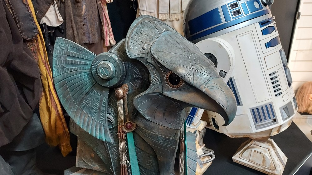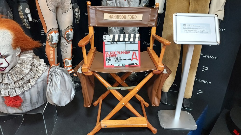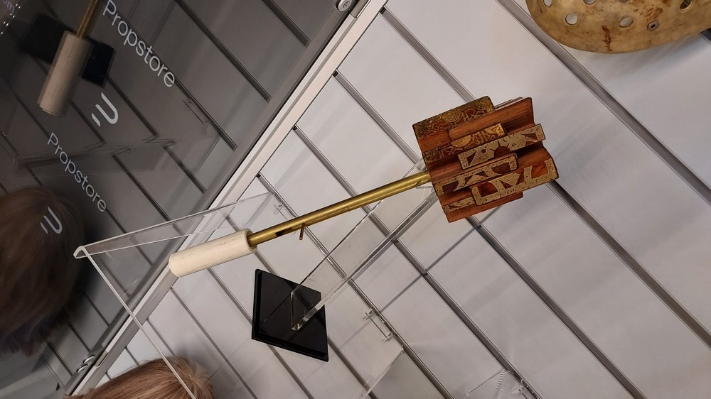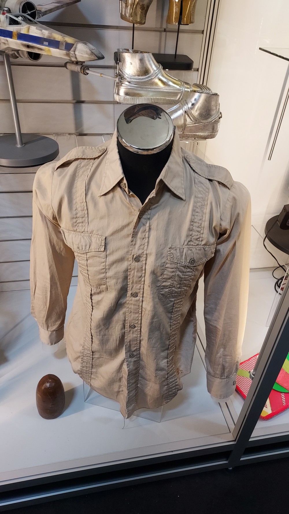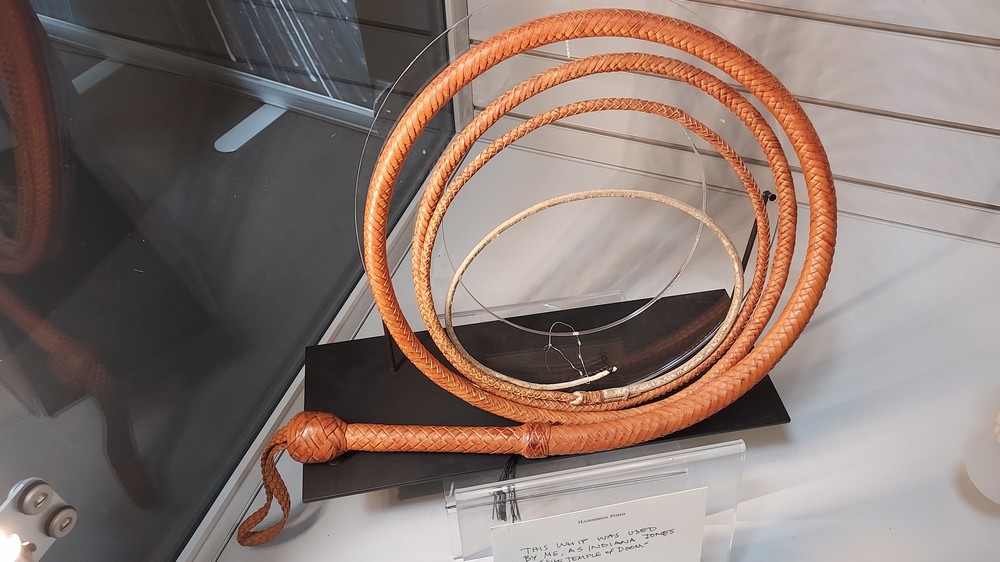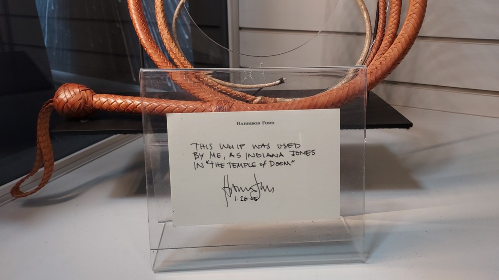Sitting alongside the Anthony Daniels items were a trio of incredible props from the Indiana Jones films. First, the short worn by Harrison Ford in Raiders of the Lost Ark, which was sent to the production of Indiana Jones and the Dial of Destiny in order to as closely match as possible for the 1944 deaged scenes. Also, one of the legendary Sankara stones and Indy’s whip from Temple of Doom, with a letter of provenance signed by Ford himself.