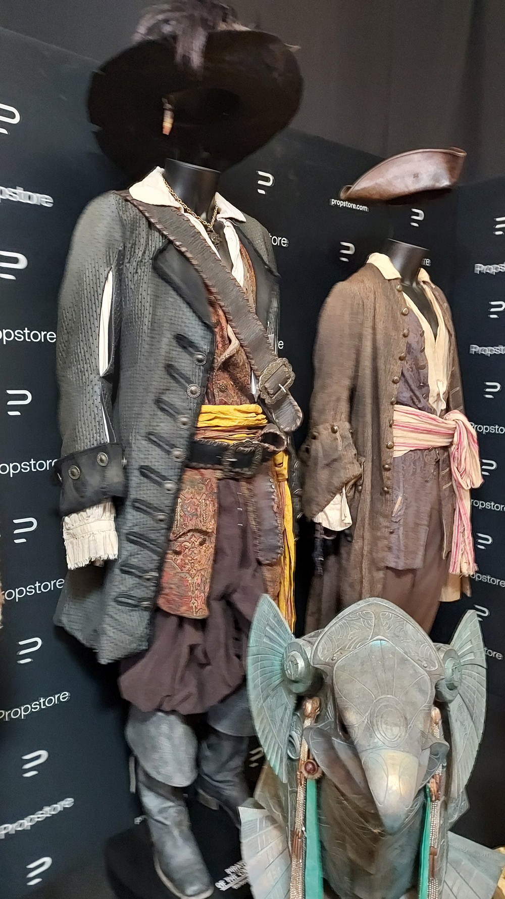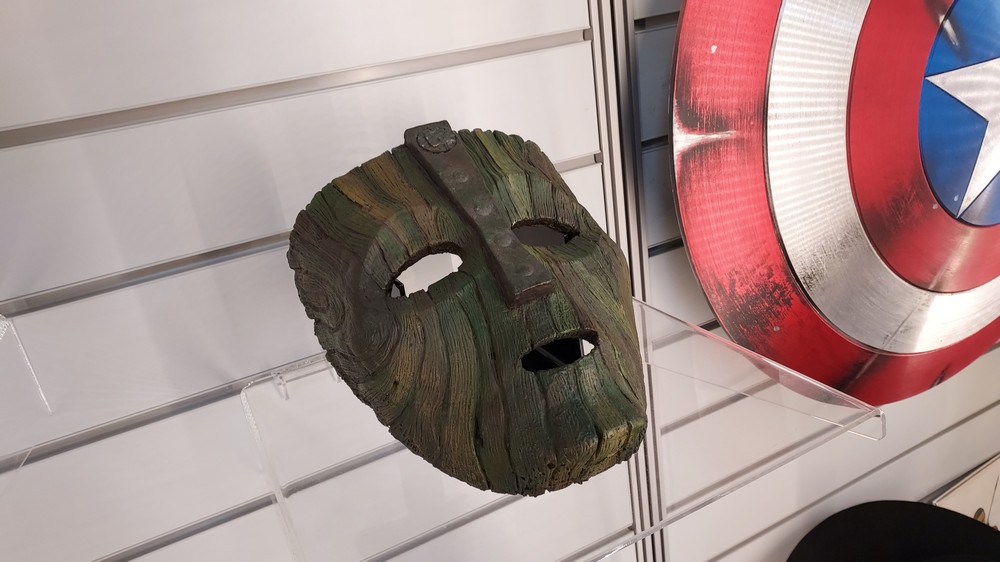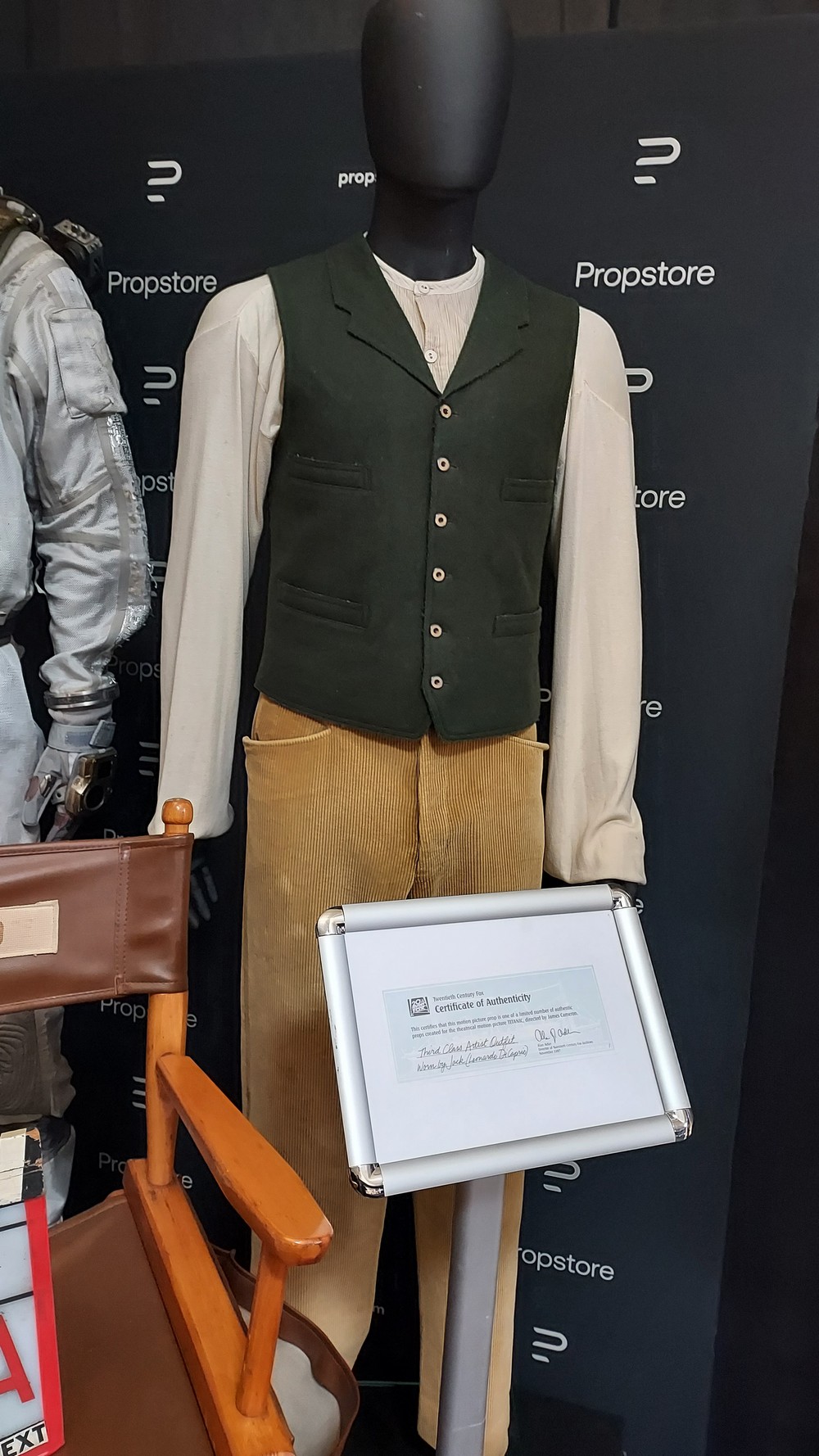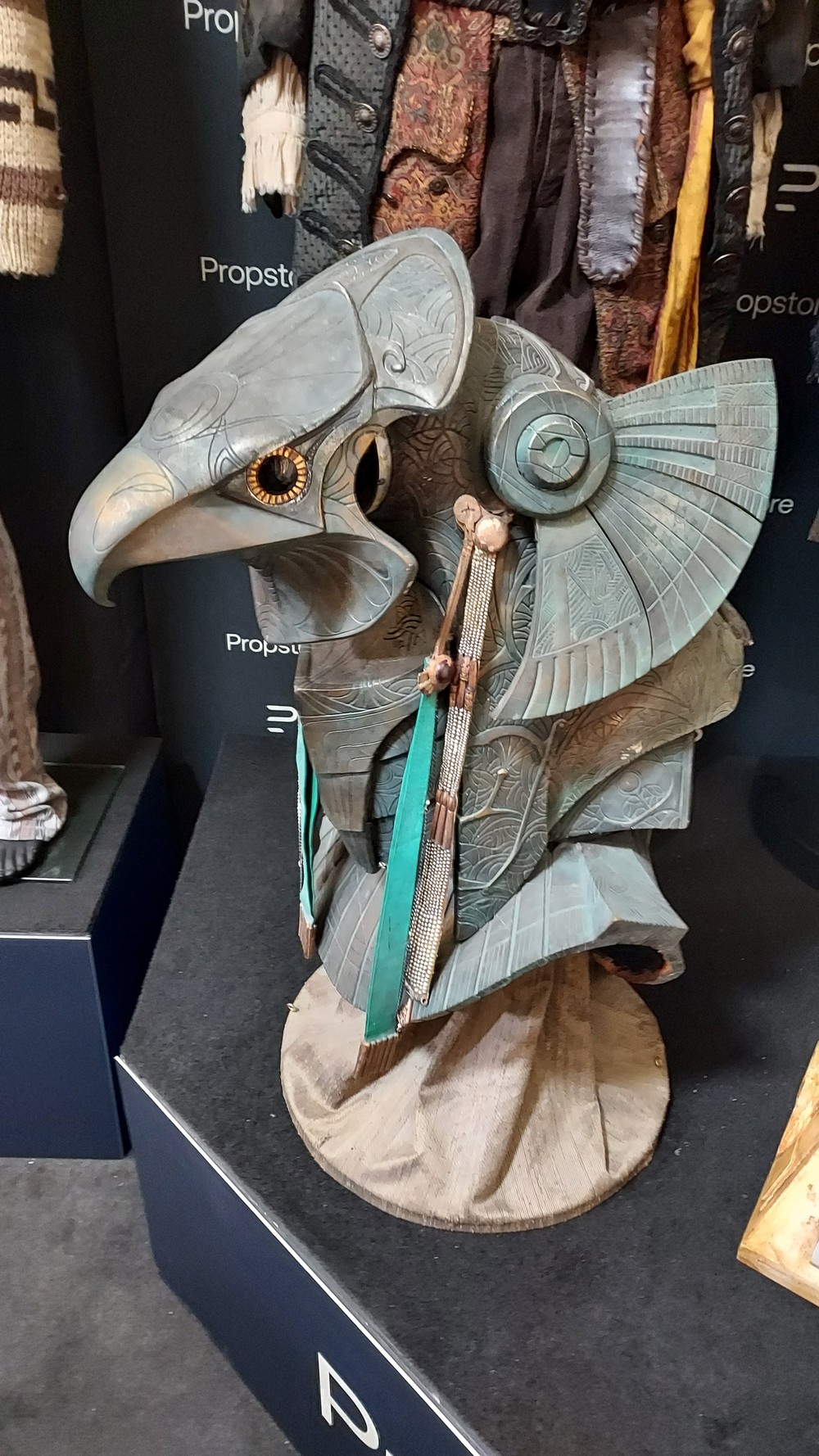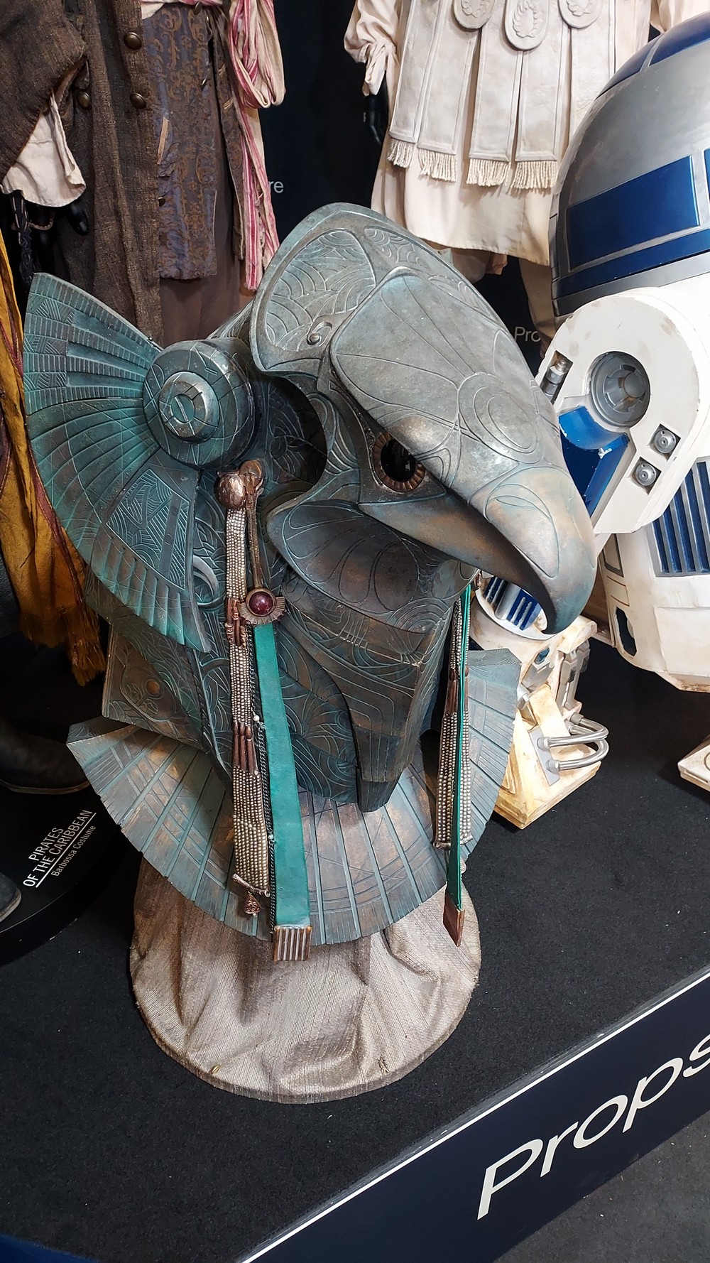 The Mask, Tron, Boardwalk Empire, Kryptonite from Superman, chest shields from Batman, a robot from Batteries Not Included, models of the robots from The Black Hole, The Bionic Woman’s face, the old and new shields from Captain America: The First Avenger, Iron man’s helmet from Captain America: Civil War, a knife from Prince of Persia, Lee van Cleef’s hat, a mask from V for Vendetta, a sketch from My Fair Lady, some original james Bond art, a helmet from A Bridge Too Far, Ursula Andress’ outfit from Dr No, Daniel Craigs suit from No Time to Die and the monsters head from A Monster Calls.