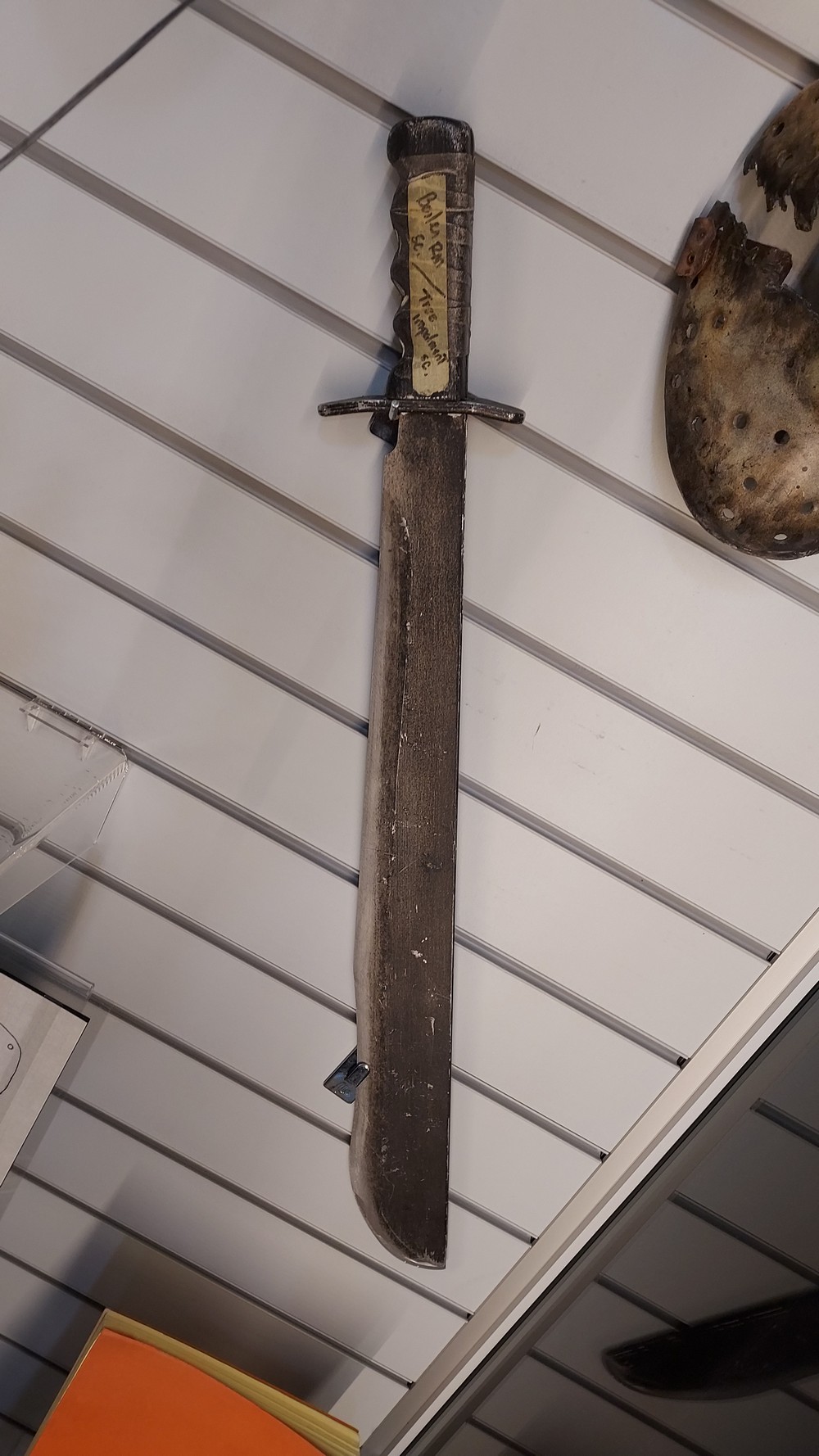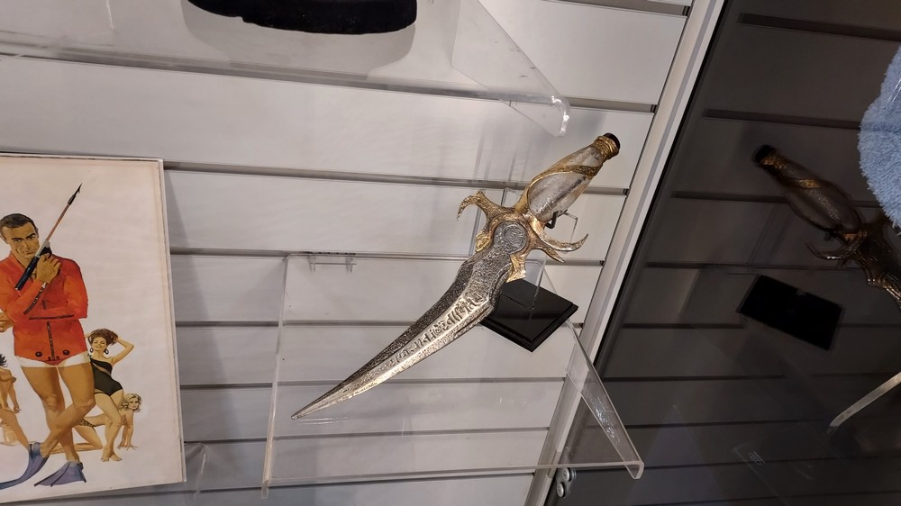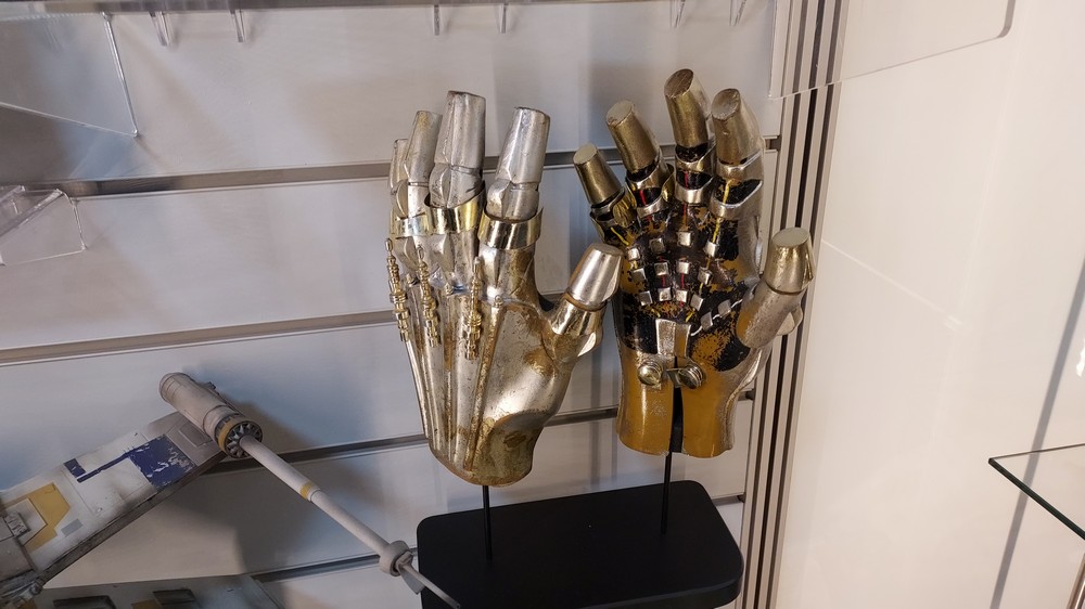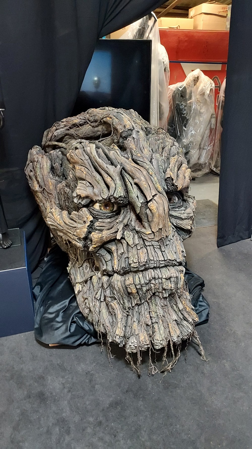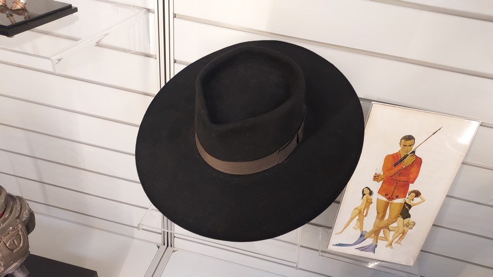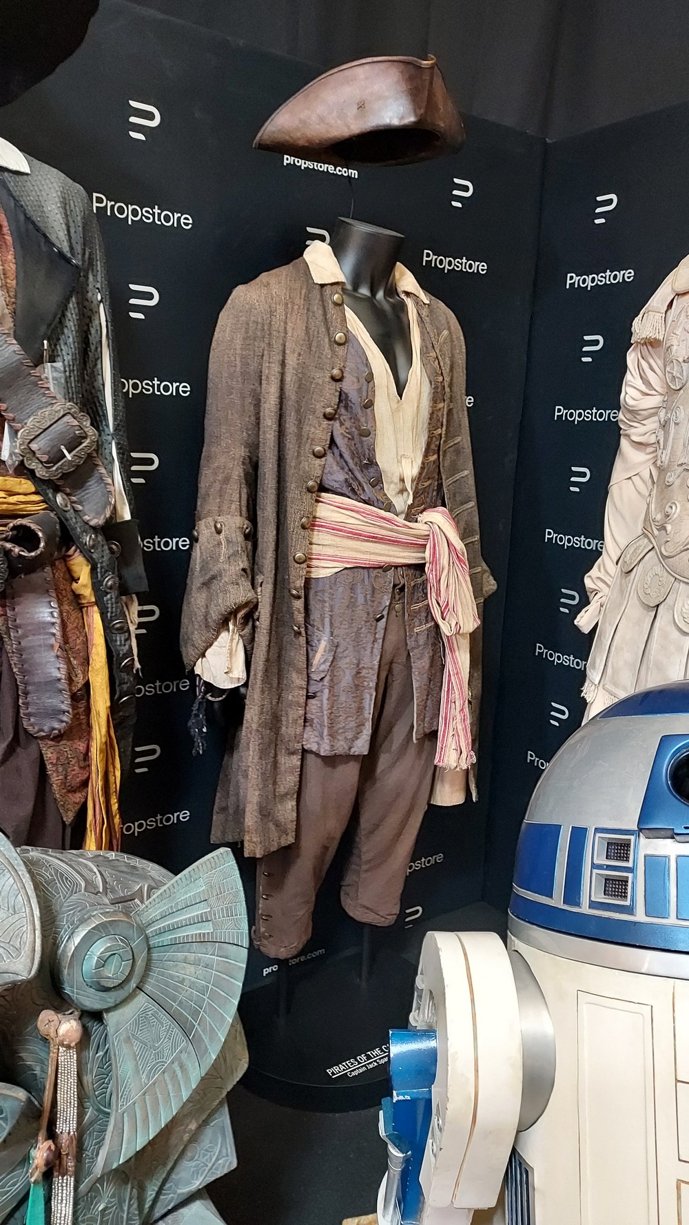 The Mask, Tron, Boardwalk Empire, Kryptonite from Superman, chest shields from Batman, a robot from Batteries Not Included, models of the robots from The Black Hole, The Bionic Woman’s face, the old and new shields from Captain America: The First Avenger, Iron man’s helmet from Captain America: Civil War, a knife from Prince of Persia, Lee van Cleef’s hat, a mask from V for Vendetta, a sketch from My Fair Lady, some original james Bond art, a helmet from A Bridge Too Far, Ursula Andress’ outfit from Dr No, Daniel Craigs suit from No Time to Die and the monsters head from A Monster Calls.
