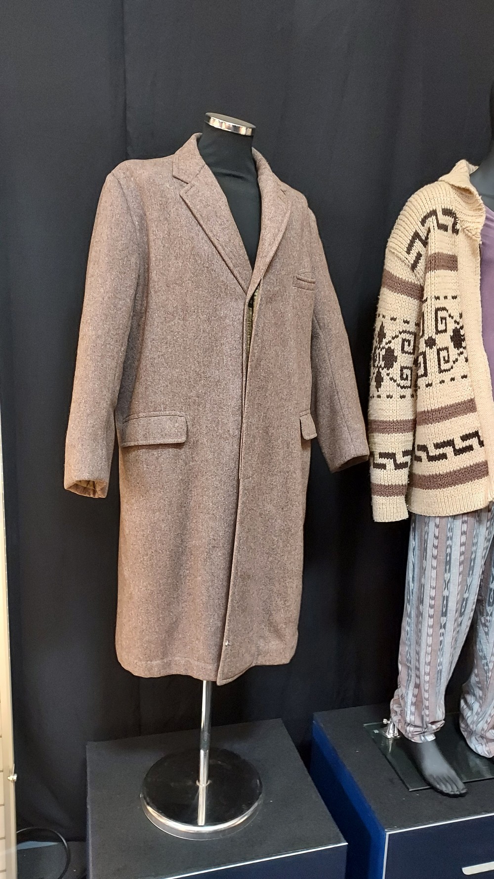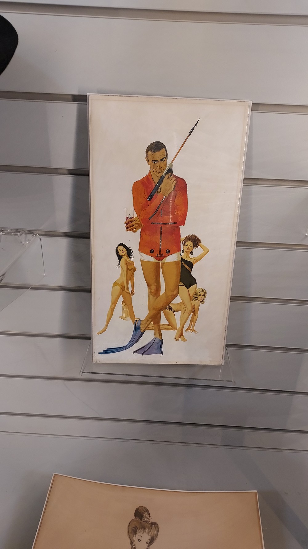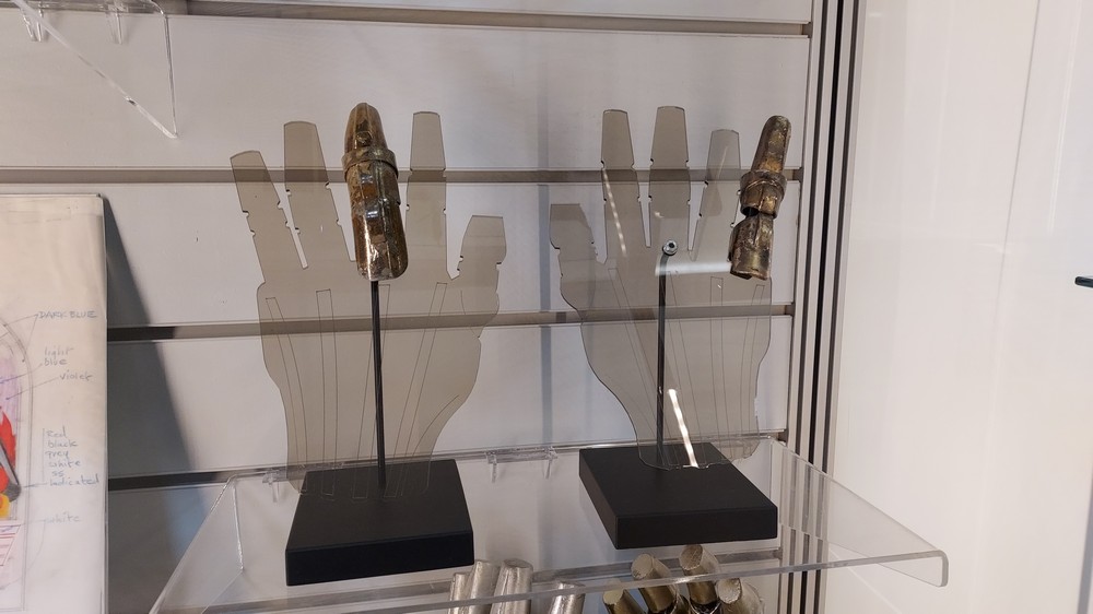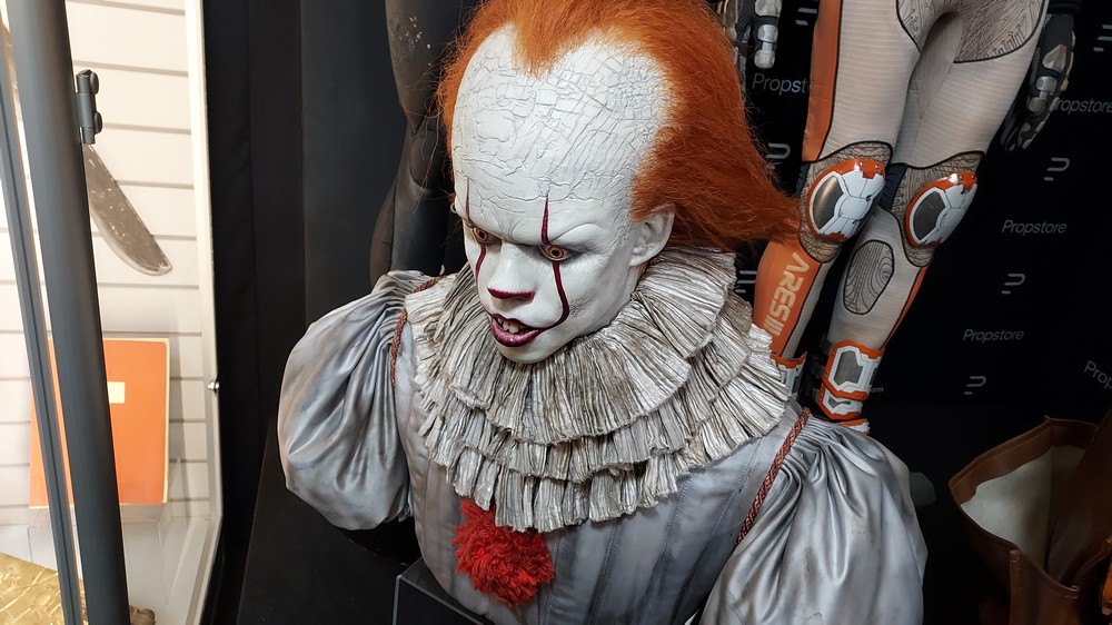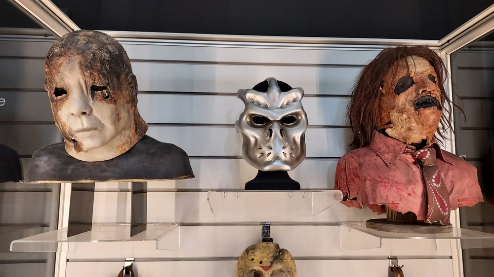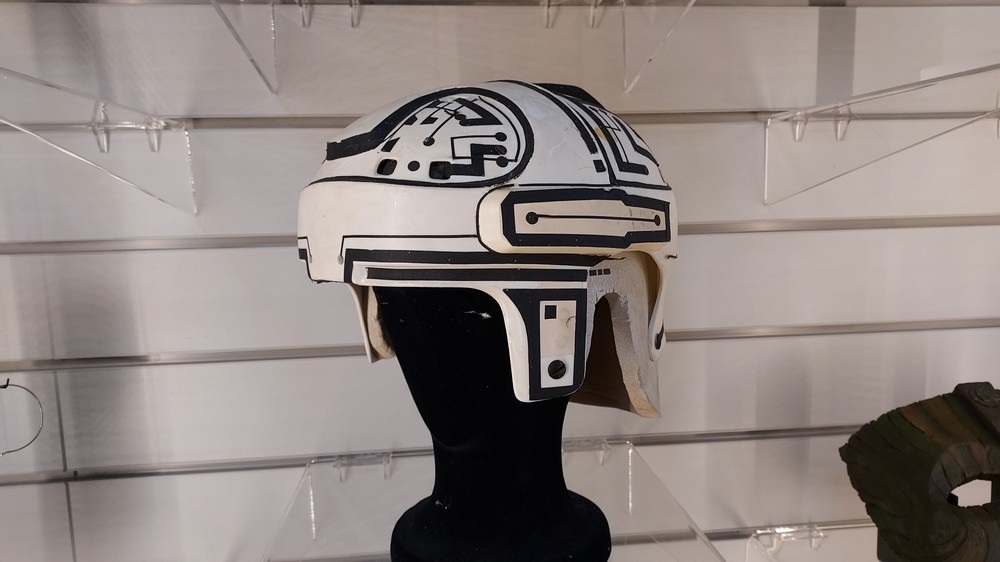 The Mask, Tron, Boardwalk Empire, Kryptonite from Superman, chest shields from Batman, a robot from Batteries Not Included, models of the robots from The Black Hole, The Bionic Woman’s face, the old and new shields from Captain America: The First Avenger, Iron man’s helmet from Captain America: Civil War, a knife from Prince of Persia, Lee van Cleef’s hat, a mask from V for Vendetta, a sketch from My Fair Lady, some original james Bond art, a helmet from A Bridge Too Far, Ursula Andress’ outfit from Dr No, Daniel Craigs suit from No Time to Die and the monsters head from A Monster Calls.