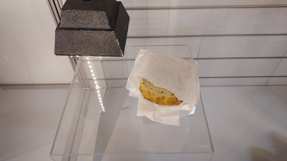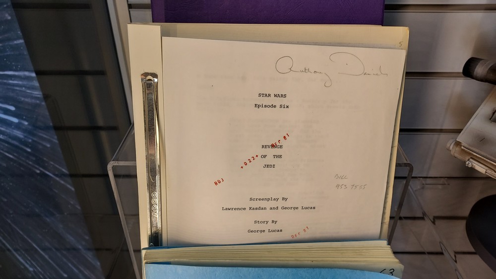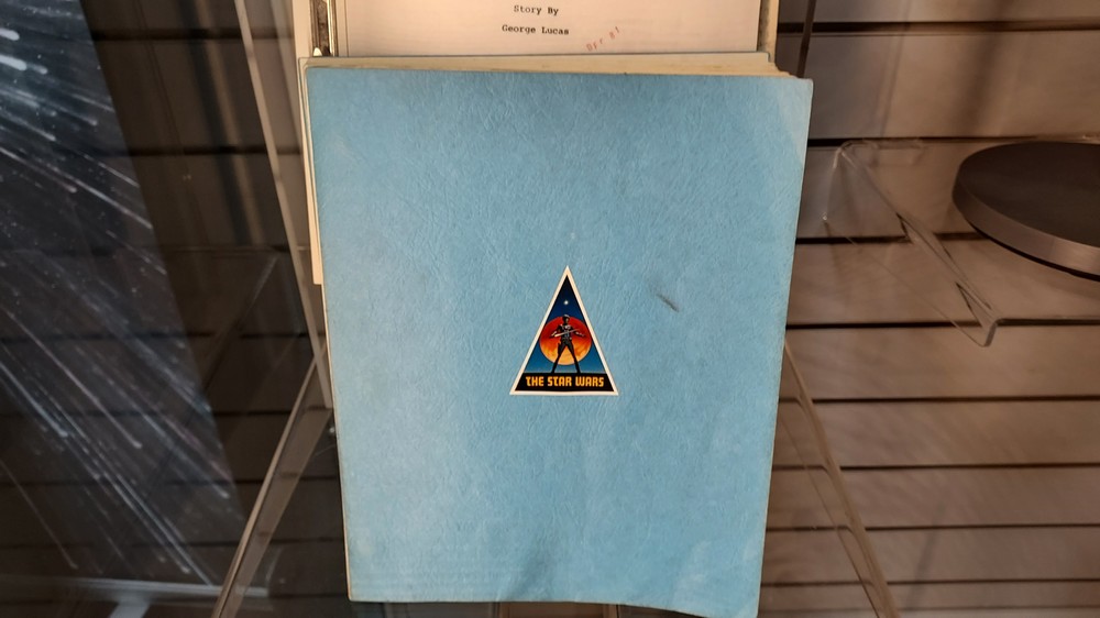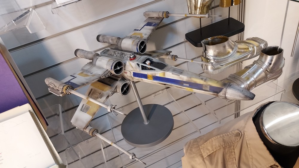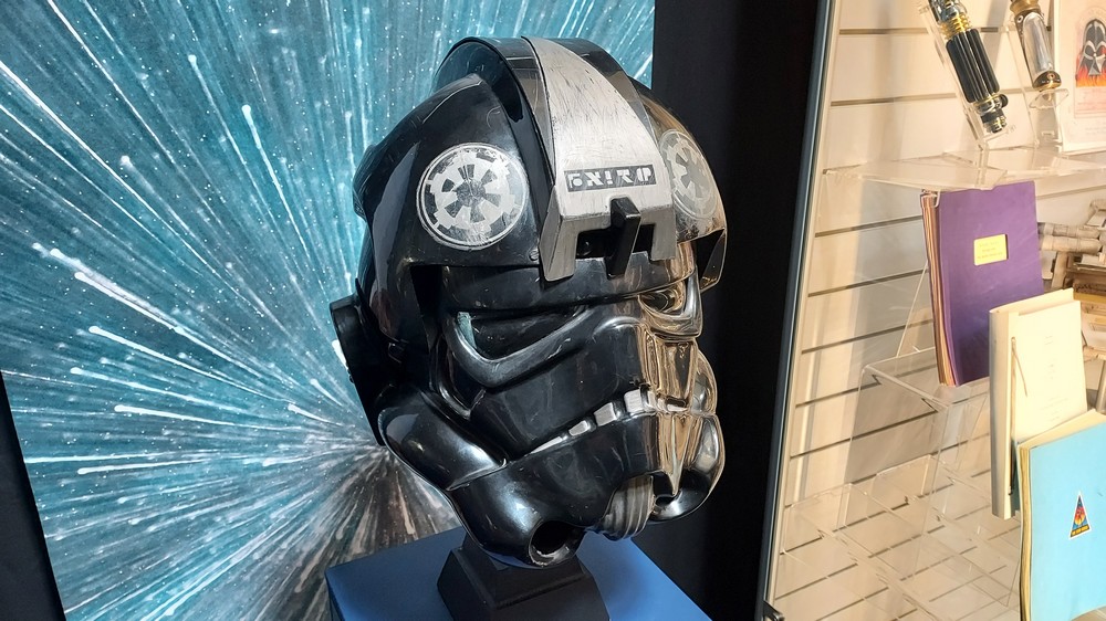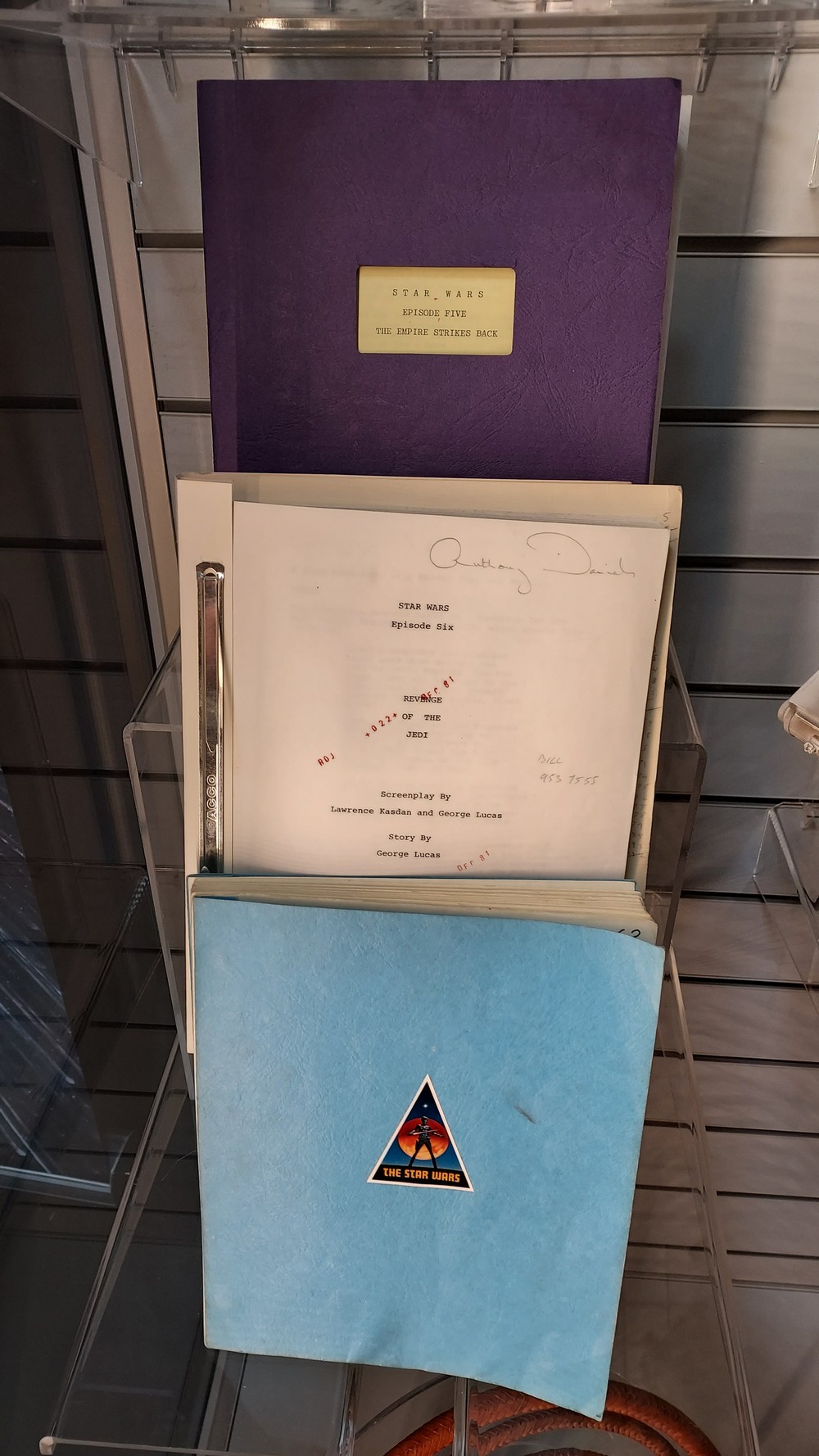 Here we have his head from A New Hope, a TIE Pilots helmet (a rare mohican version), a Star Wars script, a Snowtrooper mask, the tennis shoe from the Battle of Endor, Threepio fingers, Ralph McQuarrie’s design for the Vader in Flames logo, hero lightsabers, scripts for Star Wars, Empire and Jedi, a model of Poe Dameron’s X-Wing and Threepio’s feet.