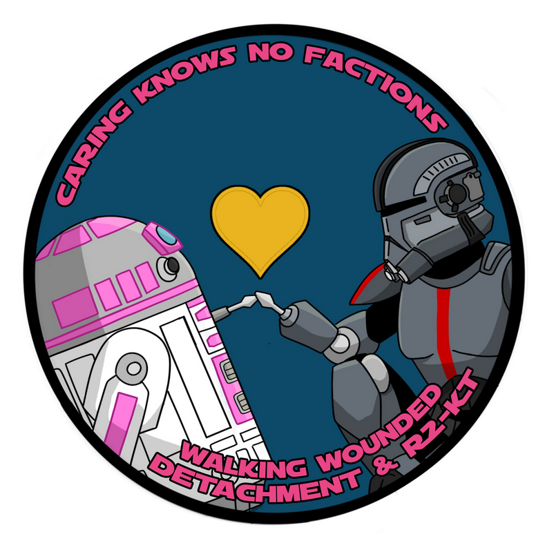 Presenting Fan Club patch #20 in the series: Caring Knows No Factions. This features the clone trooper known as Echo, who was injured and converted to a cyborg before rejoining his mates and using his cybernetic enhancements for good. To me, Echo embodies the struggles a lot of us have with physical, mental, emotional and other trauma. We work every day to overcome it and be better people. And that is the mission of the Walking Wounded Detachment.
