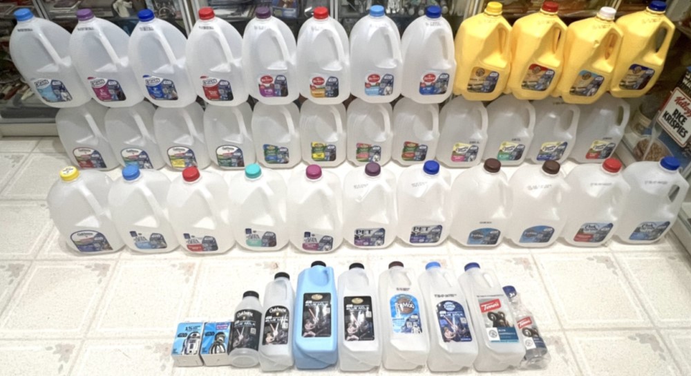 We documented 97 different milk containers across this promotion. Because it was so daunting to assemble a complete set, I only went after them opportunistically where I knew friends who might be able to find them for me, since it was impossible to find them all on my own. This photo shows 44 of the known 97 milk containers from the promotion, and since taking the photo I have increased my count to 49 different milk jugs, which is just over half of the set. Also, two of these pictured here (the Turner’s blue Bantha milk containers in the bottom right) are from a promotion in Pennsylvania from a couple years ago.