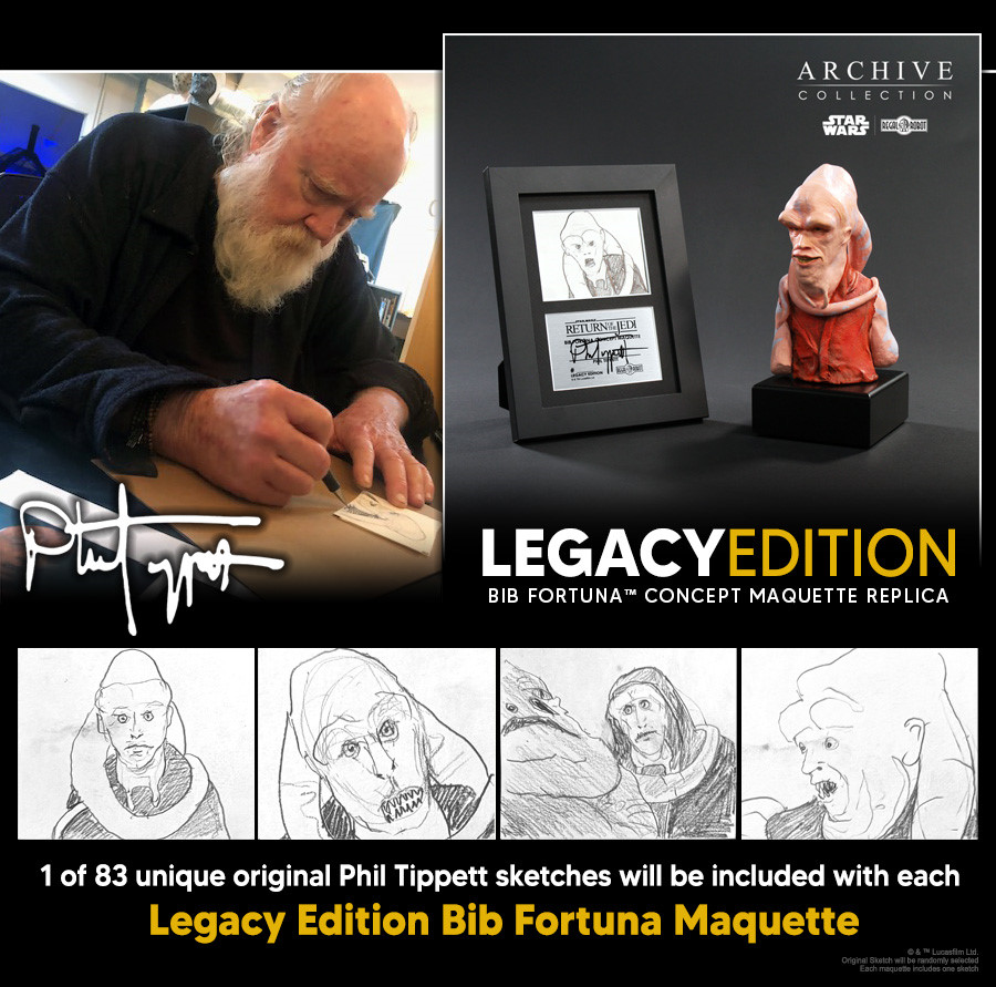 Limited to just 83 pieces, each hand-painted maquette in this Legacy Edition will include a premium expanded plaque including a one-of-a-kind Bib Fortuna sketch hand-drawn by Tippett, who not only sculpted this maquette but also was the head of the Return of the Jedi creature shop.