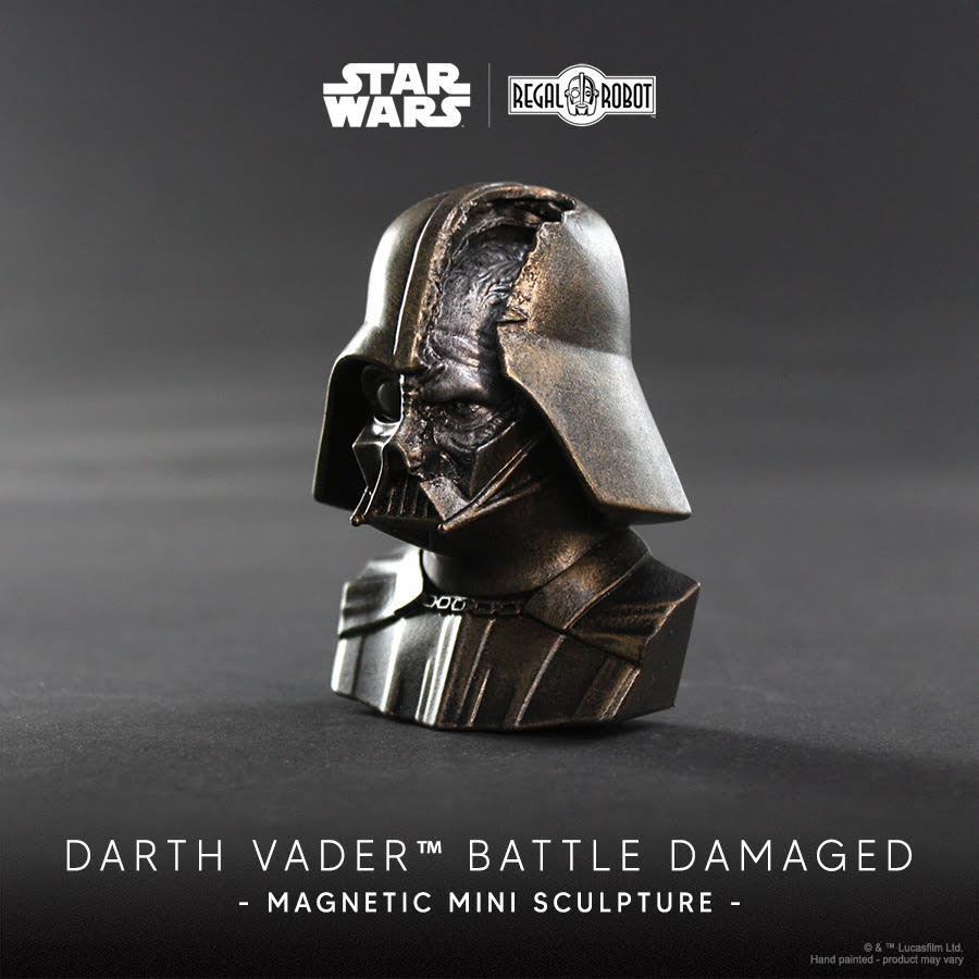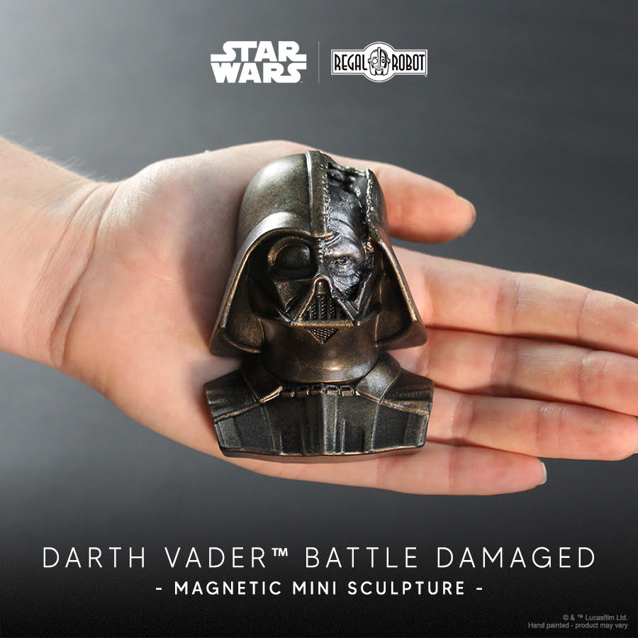 Darth Vader’s unforgettable battle-damaged look is recreated here as a highly detailed magnetic mini sculpture. Hand painted with a most impressive faux bronze finish, silver tones highlight Vader’s human form beneath the mask.