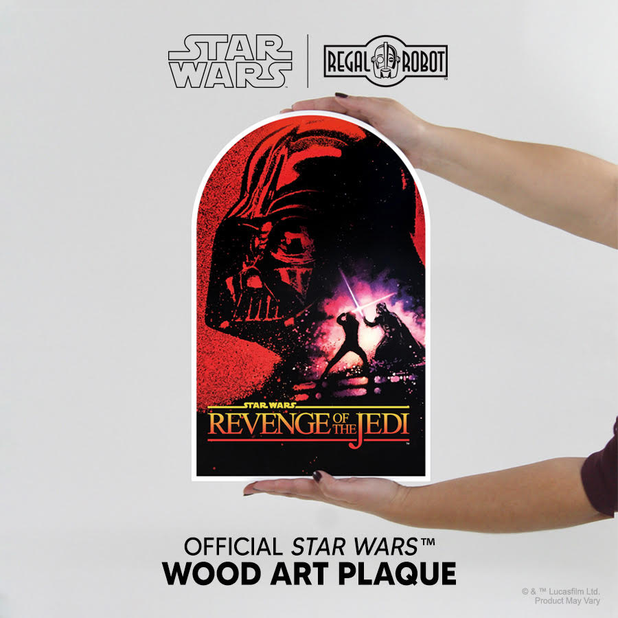 Their latest wood art plaque debuts today with art from the Revenge of the Jedi advance teaser poster. A working title for Star Wars: Return of the Jedi™, for many fans in 1982 (Regal’s company founder, Tom Spina, was among them!) this teaser on the walls of their local theaters was the first glimpse into the finale of the original Star Wars™ trilogy. This is a 16″ tall plaque with striking, classic art features the silhouette of Luke Skywalker™ and Darth Vader’s™ climactic lightsaber™ battle over a menacing closeup of the visage of the Dark Lord of the Sith™.