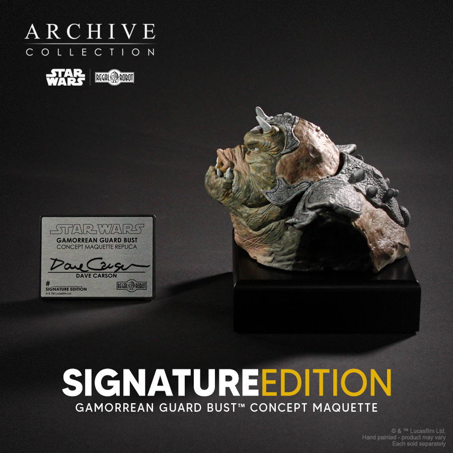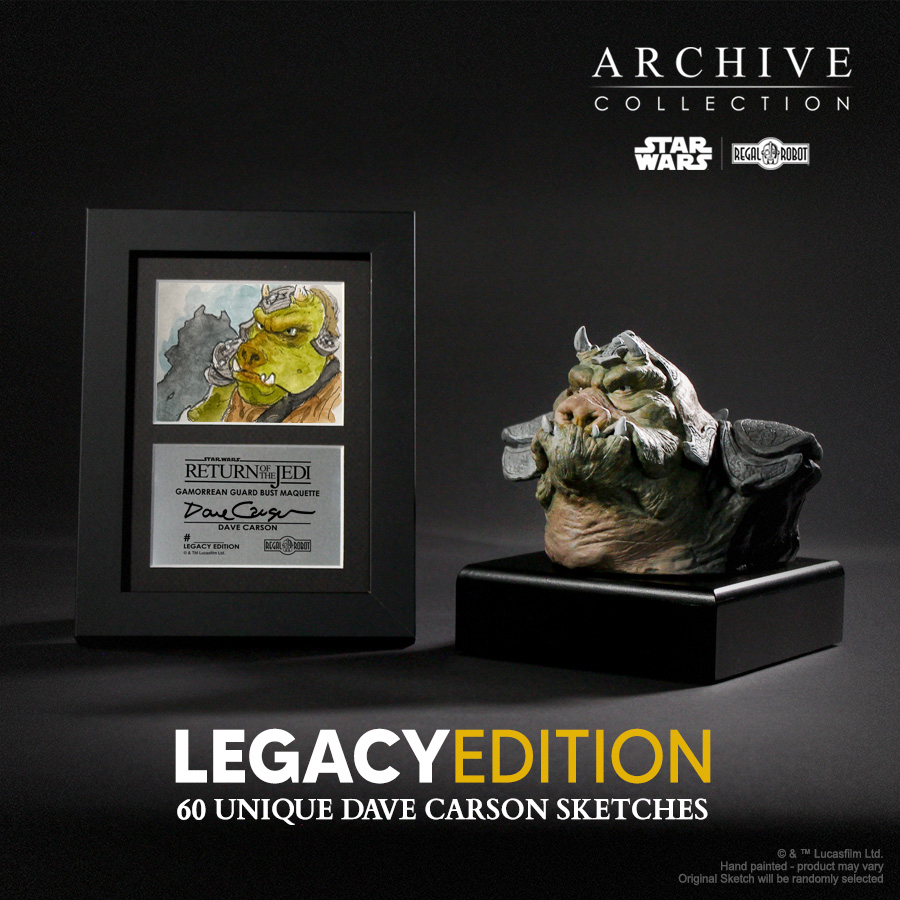 The extremely limited Legacy Edition of just 60 pieces in goes beyond a signature edition to provide each owner with a truly unique work-of-art. Each hand-painted maquette in this Legacy Edition will include a premium expanded plaque including a full color, one-of-a-kind Gamorrean Guard illustration, hand-drawn and watercolor painted by Carson.