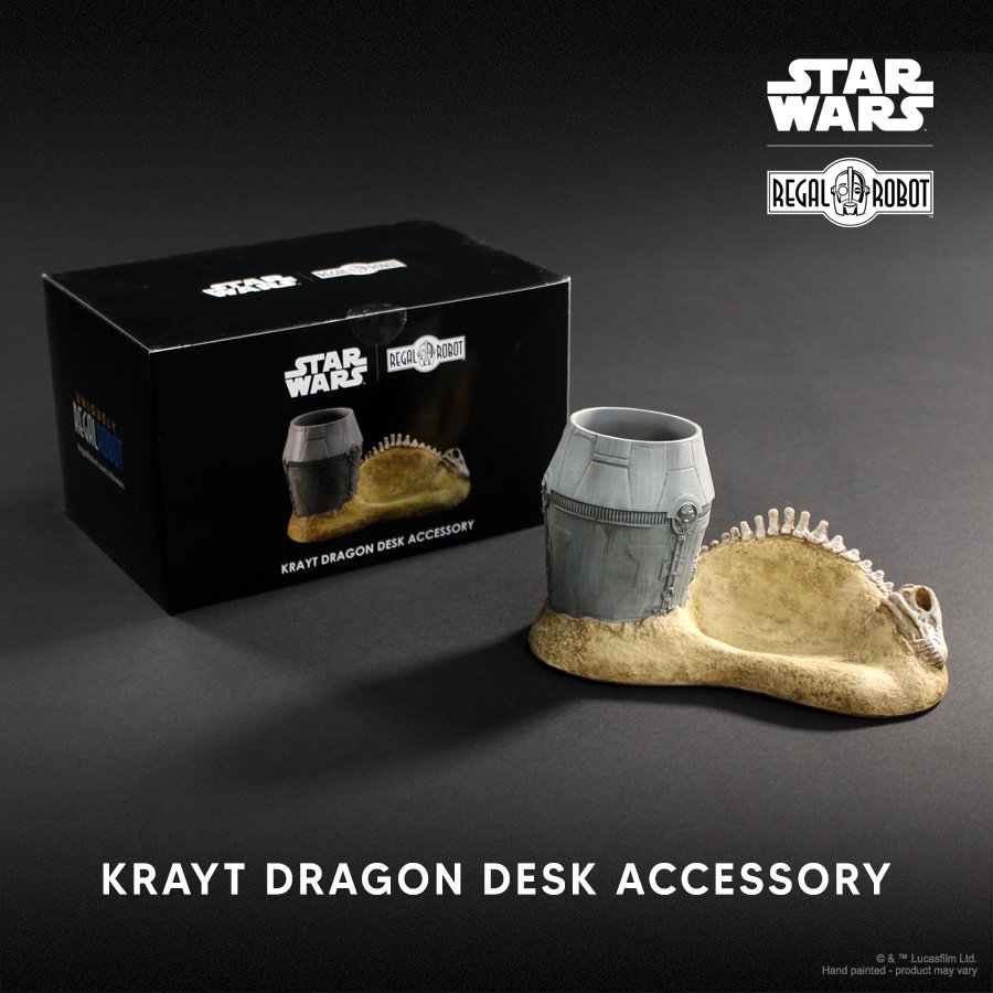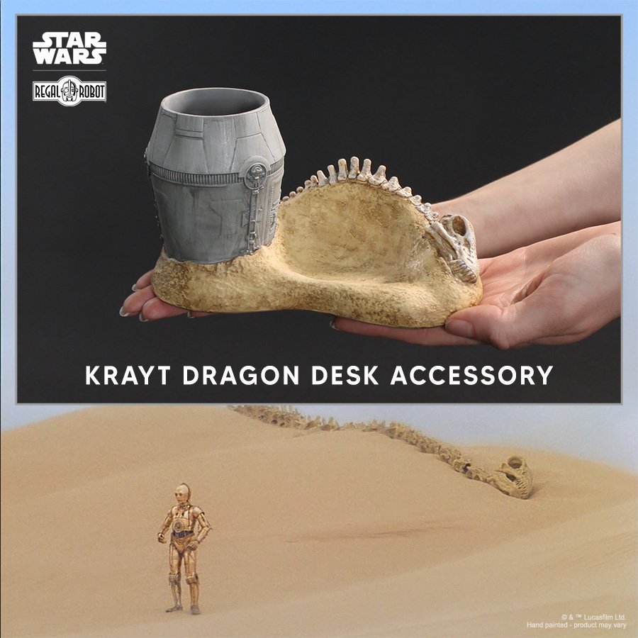 It’s one of the many scourges of the Tatooine desert, and the first mega fauna we saw in the Star Wars galaxy (well, its skeleton at least), and now you can put that terrible sepent to good use as a desk organiser. From the nostalgia wizards at Regal Robot, this is the Krayt Dragon Desk Organizer and it can be yours for $69.00, with US shipping $12.50 and just like its real-world counterpart is in limited numbers, so pick out your best pens and pencils and get your orders in now.