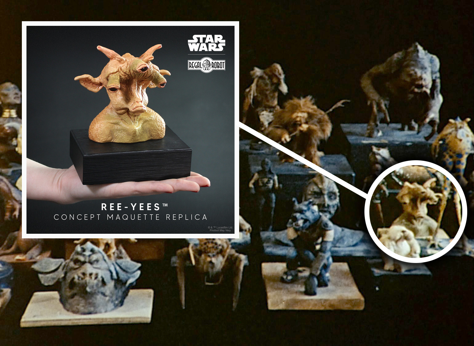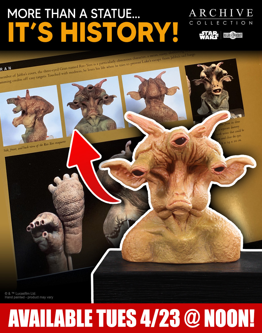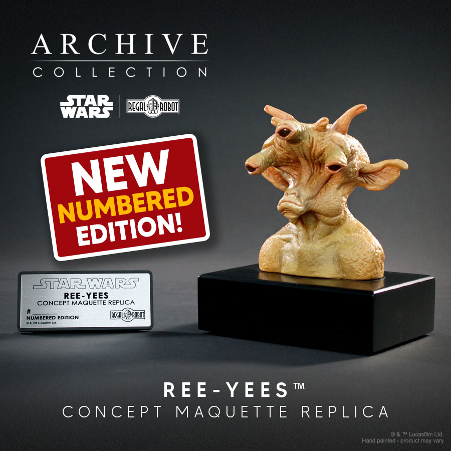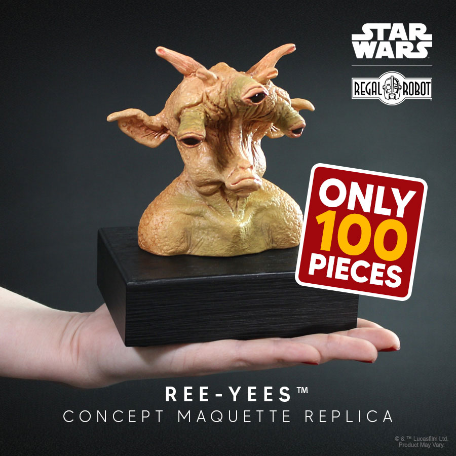 On April 23rd at 12 Noon EST fans will have a chance to order this new, limited Numbered Edition Ree-Yees Concept Maquette Replica. The original Signature Edition of this maquette sold out in just a few hours. Regal fans and collectors quickly filled a long waitlist for the character. With this being a rare instance of a maquette replica with only a single edition, many fans requested we add a Numbered Edition as we’ve done with Max Rebo, Weequay and others.