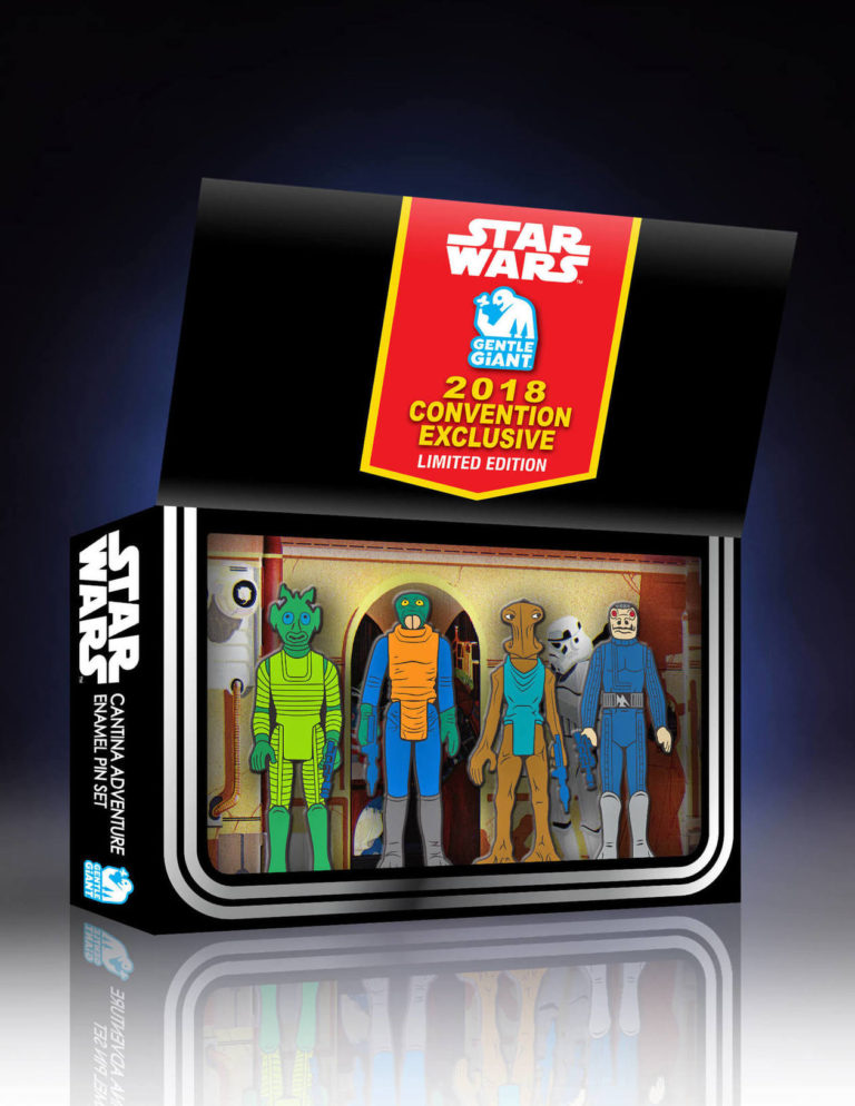 The enamel pin craze has swept the planet and once again pop culture fandom is on the forefront of that trend. Gentle Giant Toys is beyond excited to step into this arena with the biggest juggernaut license in the galaxy – Star Wars! The first release of our officially licensed Star Wars pins will be available exclusively at SDCC 2018! This officially licensed cloisonné hard enamel exclusive 4-pack boxed set of our 1.75” pins features the original 4 Cantina aliens from the vintage Star Wars line packed together in one set just like 1978! Get them all at once in a cool retro inspired box and show off your “geek cred” for all to see! Even if you did not collect the toy line, these pins are epic and charming in their historical significance and design.